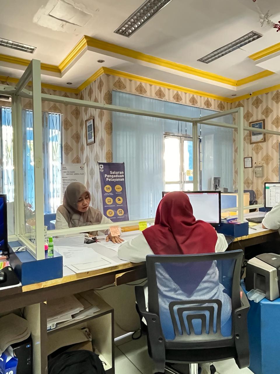 Bendahara Dinas Pendidikan dan Kebudayaan Kabupaten Donggala melakukan konsultasi mengenai pengenaan pajak atas transaksi yang dilakukan dengan rekanan pengusaha jasa tata rias. Konsultasi berlangsung di Tempat Pelayanan Trepadu (TPT) KP2KP Banawa, Kabupaten Donggala, Sulawesi Tengah (Senin, 22/1).