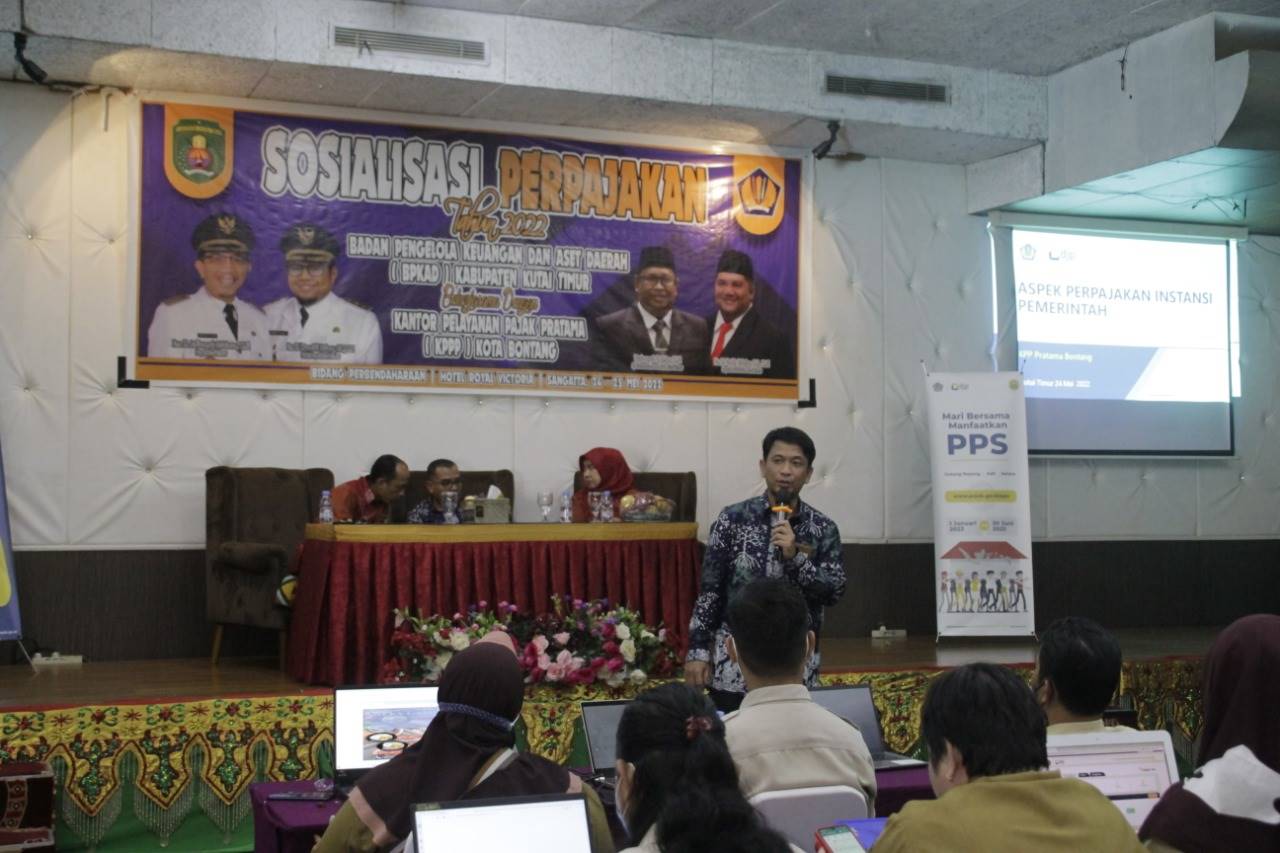 Kantor Pelayanan Pajak (KPP) Pratama Bontang beserta dengan Badan Pengelola Keuangan dan Aset Daerah (BPKAD) menyelenggarakan kegiatan sosialisasi perpajakan Instansi Pemerintah di Kota Bontang (Selasa, 24/05). Dengan diikuti oleh bendahara Instansi Pemerintah Kabupaten Kutai Timur, kegiatan dimulai pada pukul 08.00 WITA sampai dengan 16.00 WITA.
