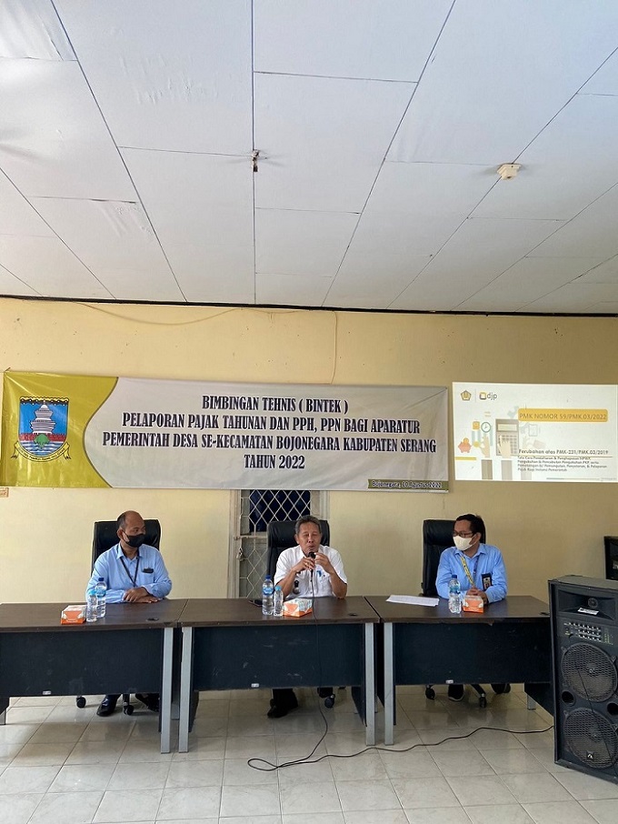Untuk memenuhi undangan narasumber bimbingan teknis dan meningkatkan pengetahuan masyarakat mengenai pelaporan SPT Masa Unifikasi di Kecamatan Bojonegara, KPP Pratama Serang Timur melakukan sosialisasi dan bimbingan teknis pelaporan SPT Masa Unifikasi di Kecamatan Bojonegara. Rangkaian kegiatan dimulai dari sambutan Camat Bojonegara sampai pada kegiatan asistensi yang dilakukan oleh Account Representative dan Fungsional Penyuluh KPP Pratama Serang Timur kepada seluruh bendahara desa di lingkungan Kecamatan Bojonegara.