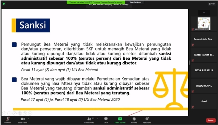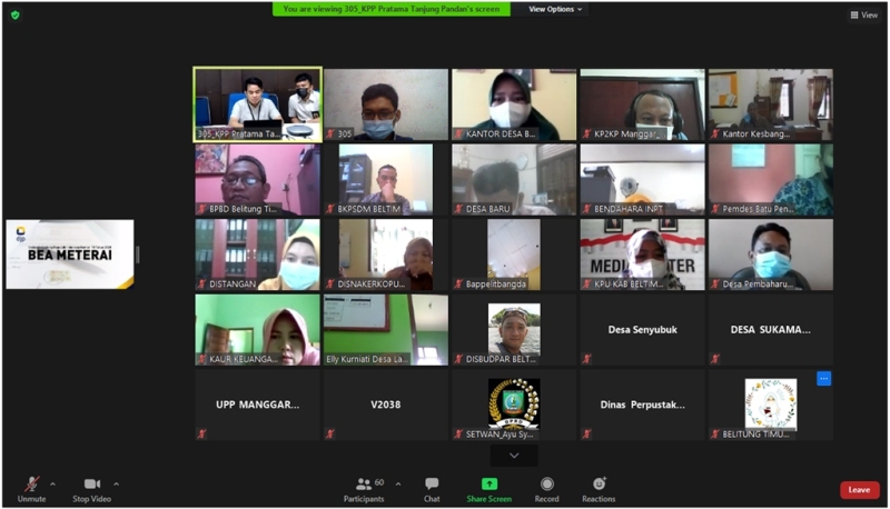 Kelas Pajak Manggar kembali menyelenggarakan kegiatan edukasi perpajakan secara daring melalui Aplikasi Zoom Meeting dan diikuti 60 partisipan. Kegiatan ini juga mewujudkan sinergi antara KP2KP Manggar dan KPP Pratama Tanjung Pandan. Kegiatan diselenggarakan oleh KP2KP Manggar dengan narasumber dari Tim Fungsional Penyuluh KPP Pratama Tanjung Pandan.