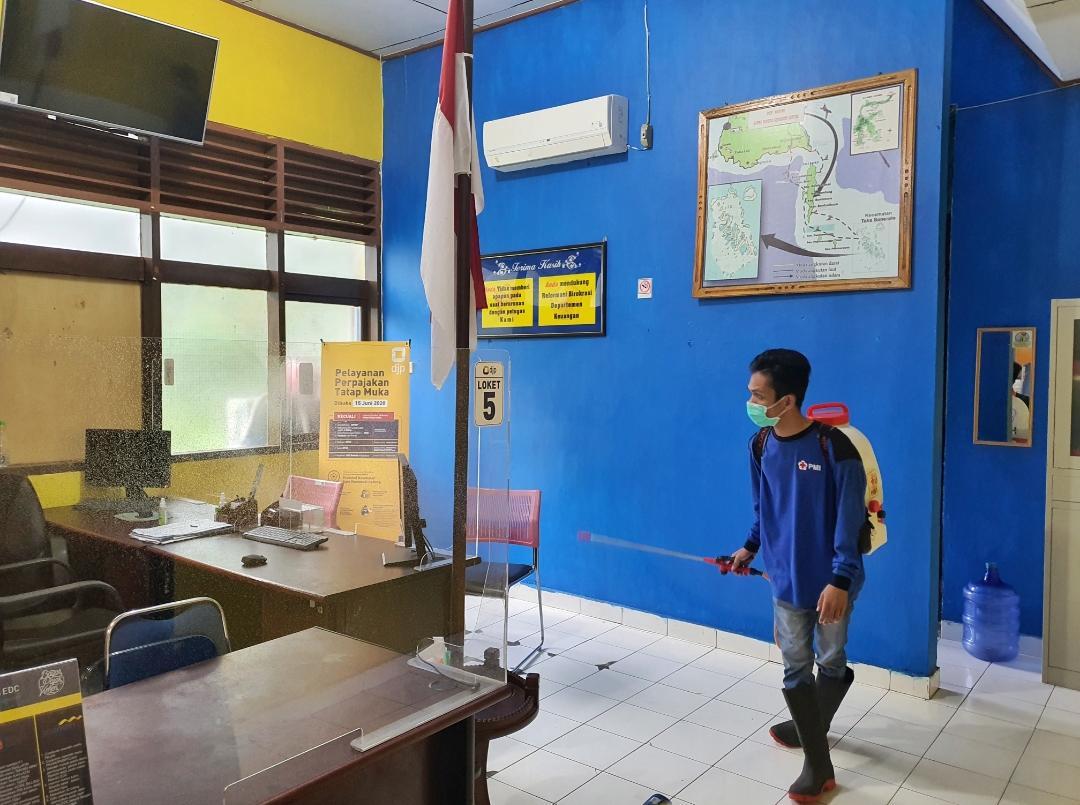 Kantor Pelayanan, Penyuluhan dan Konsultasi Perpajakan (KP2KP) Benteng bersama Palang Merah Indonesia (PMI) Kabupaten Kepulauan Selayar menyemprot disinfektan di KP2KP Benteng, Kepulauan Selayar, Sulawesi Selatan (Selasa, 19/1).
