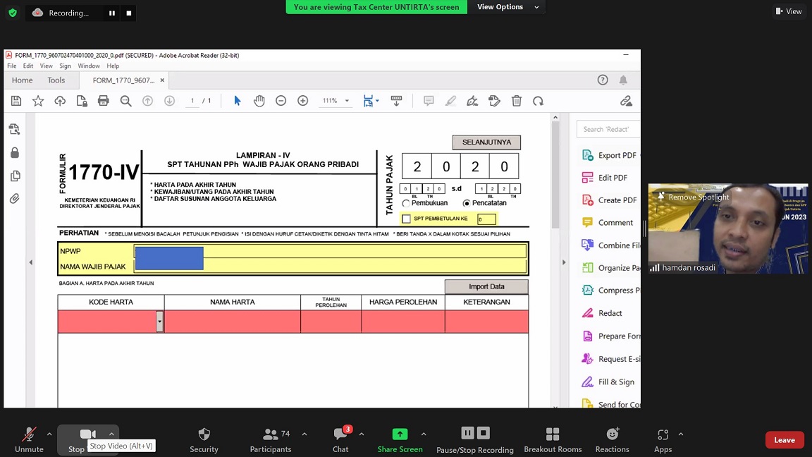 Kantor Wilayah Direktorat Jenderal Pajak (Kanwil DJP) Banten berkolaborasi dengan Kantor Pelayanan Pajak (KPP) Pratama Serang Barat dan Tax Center Universitas Sultan Ageng Tirtayasa (Untirta) melakukan sosialisasi kepada puluhan dosen dan mahasiswa secara hybrid melalui aplikasi Zoom Cloud Meeting dan Aula Untirta di Kota Serang, Banten (Selasa, 28/02).