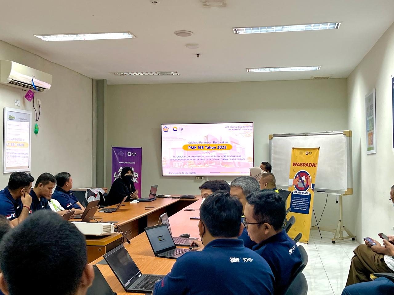 Kantor Pelayanan Pajak (KPP) Madya Dua Bandung menggelar sosialisasi terkait Peraturan Menteri Keuangan (PMK) Nomor 168 Tahun 2023 di PT Valeo AC Indonesia, Jalan Bukit Nagasari II, Kota Bukit Indah, Kabupaten Purwakarta (Kamis, 14/3).