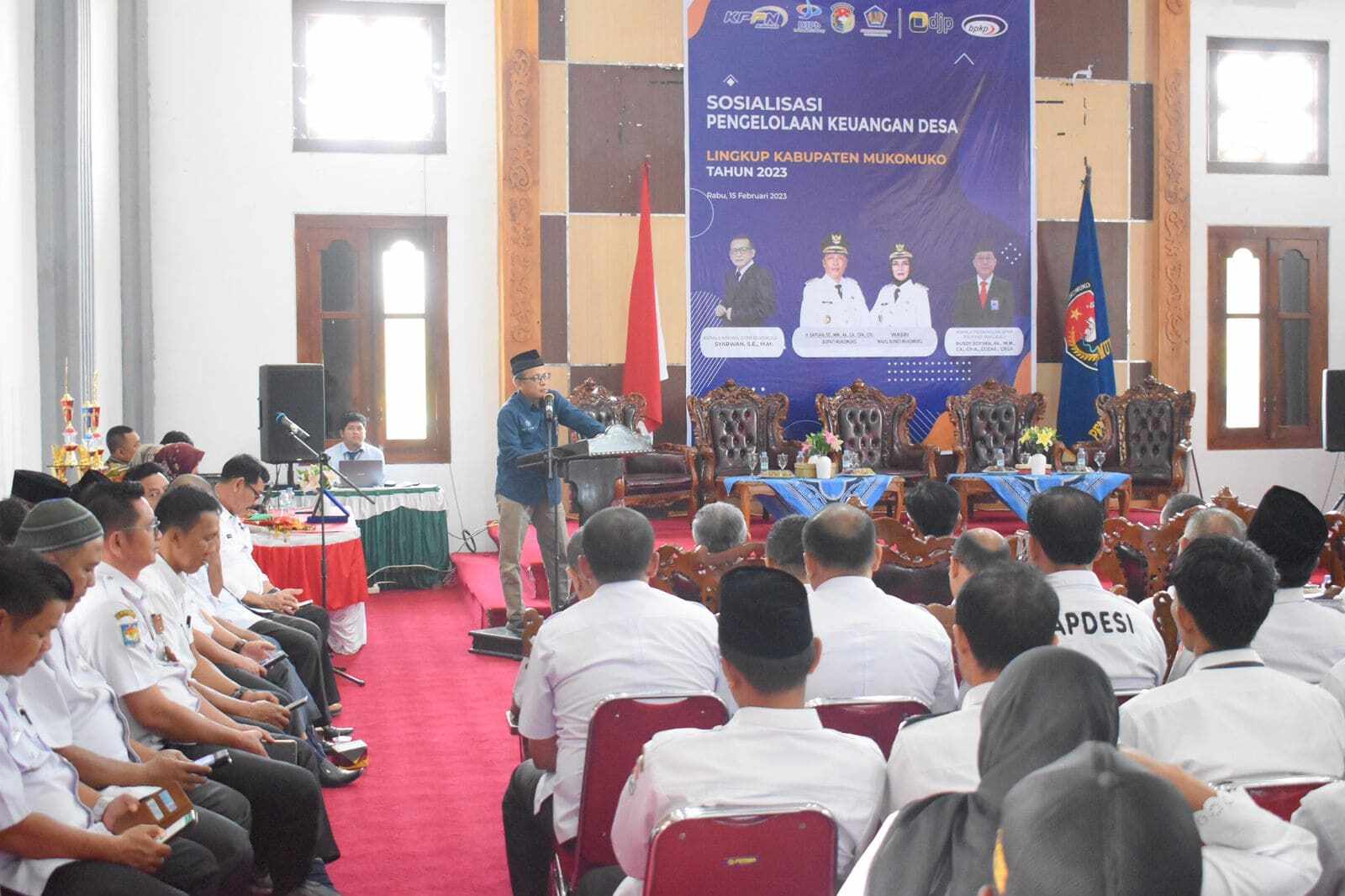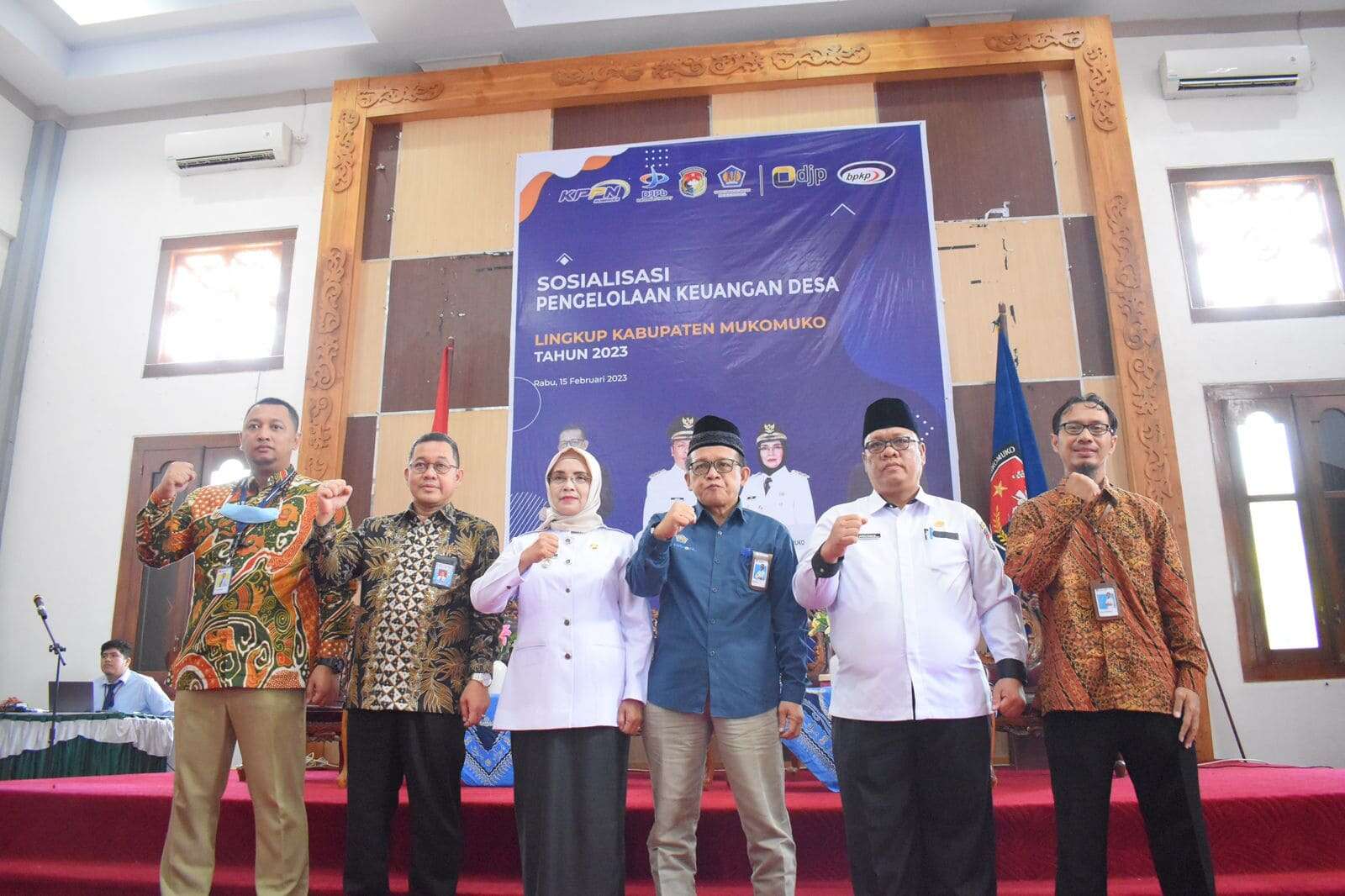 Kantor Pelayanan, Penyuluhan, dan Konsultasi Perpajakan (KP2KP) Mukomuko bersinergi dengan Kantor Pelayanan Perbendaharaan Negara (KPPN) Mukomuko melaksanakan sosialisasi Pengelolaan Keuangan Desa Lingkup Kabupaten Mukomuko Tahun 2023 di Balai Daerah Mukomuko, Kota Mukomuko (Rabu, 15/2).