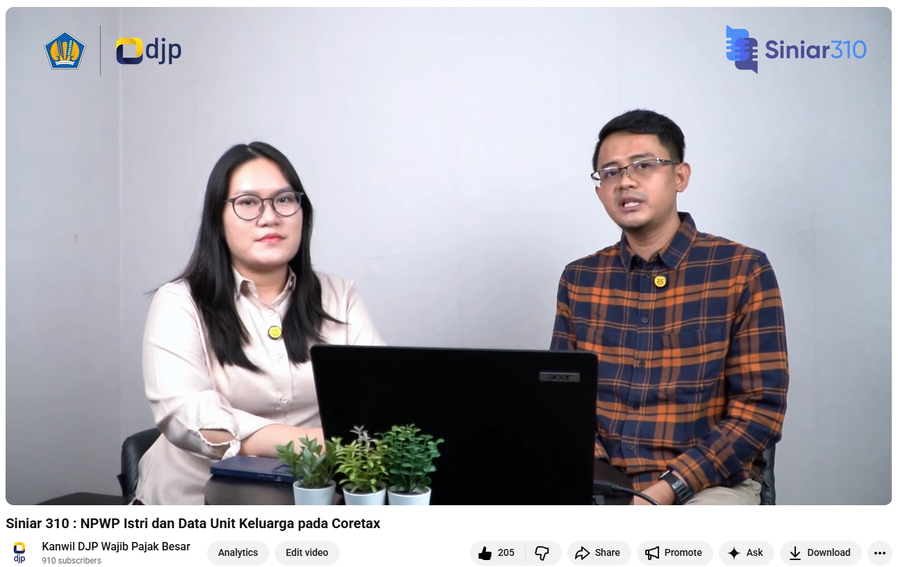 Kantor Wilayah Direktorat Jenderal Pajak (Kanwil DJP) Wajib Pajak Besar kembali menghadirkan konten edukatif melalui kanal YouTube resminya dengan merilis Siniar 310 bertajuk NPWP Istri dan Data Unit Keluarga pada Coretax. Siniar yang tayang pada bulan Desember lalu tersebut hingga hari ini telah ditonton lebih dari 21 ribu kali, menunjukkan tingginya minat masyarakat terhadap topik perpajakan keluarga (Rabu, 15/4).