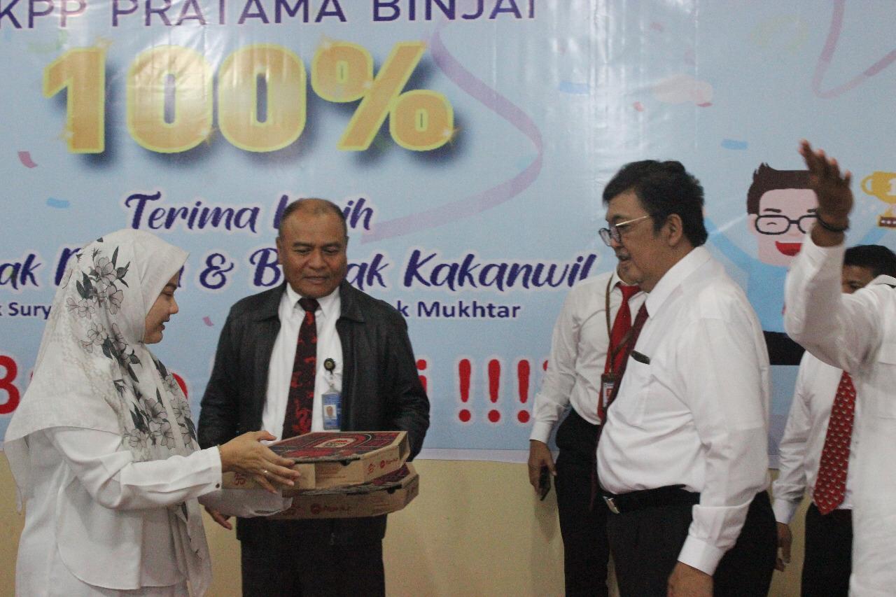 Kepala Kanwil Direktorat Jenderal Pajak Sumatera Utara I Mukhtar memberikan apresiasi kepada Kantor Pelayanan Pajak (KPP) Pratama Binjai karena target penerimaan kantor yang diamanahkan, telah terlampaui. Pemberian apresiasi tersebut diadakan di aula lantai 1 KPP Pratama Binjai (Senin, 30/12).