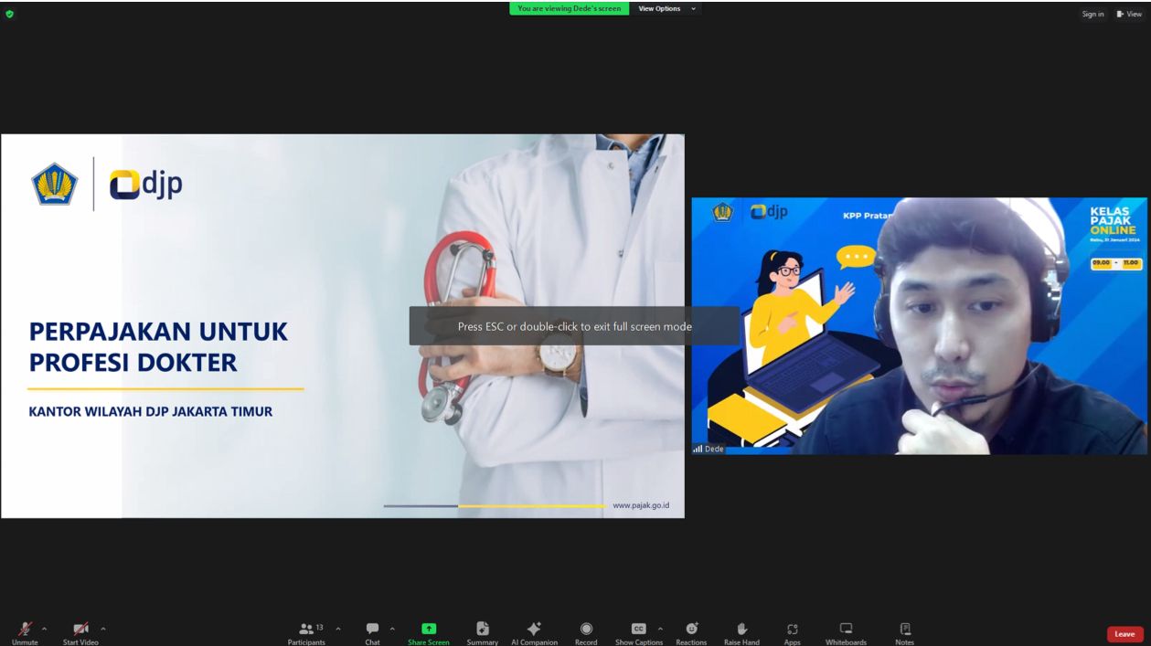 Kantor Pelayanan Pajak (KPP) Pratama Jakarta Pulogadung menggelar kelas pajak dalam rangka menambah wawasan dan pemahaman perpajakan bagi wajib pajak, khususnya seluruh kepala/koordinator/penanggung jawab unit dan dokter di Rumah Sakit Khusus Bedah (RSKB) Rawamangun, Jakarta Timur. Kegiatan kelas pajak diselenggarakan secara online melalui aplikasi Zoom Meeting (Kamis, 7/3).