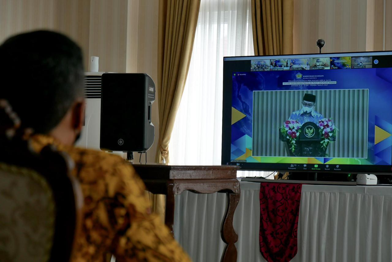 Bupati Barito Utara Nadalsyah menandatangai perjanjian kerja sama Optimalisasi Pemungutan Pajak Pusat dan Pajak Daerah antara DJP, DJPK, dan Pemda Tahap III di Rumah Jabatan Bupati Barito Utara (Rabu, 21/4).