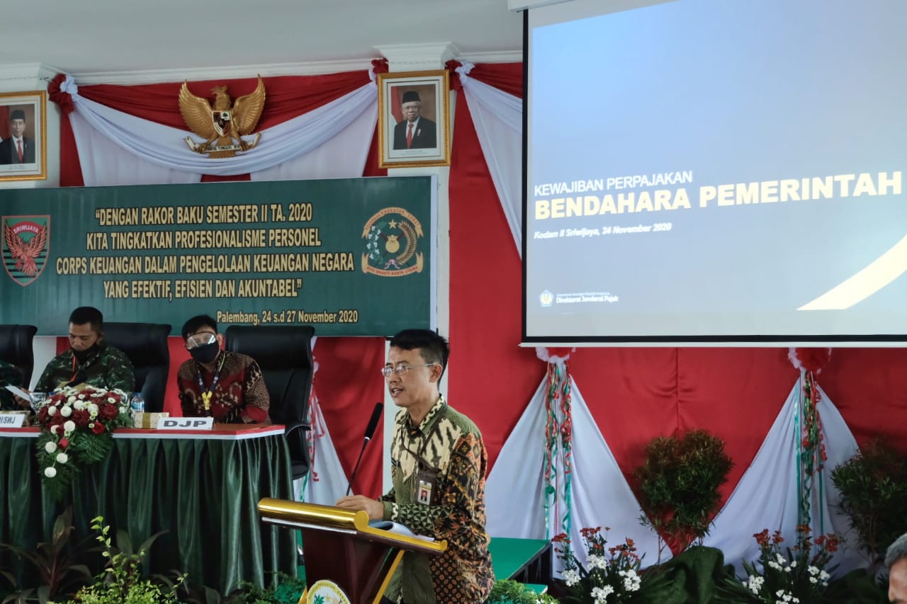Kepala Bidang P2Humas Kanwil Ditjen Pajak Sumsel dan Kep. Babel M. Riza Fahlevi hadir sebagai narasumber dalam Rapat Kordinasi Badan Keuangan (Rakor Baku) Tersebar Satuan Keuangan Kodam II/ Sriwijaya (Selasa,24/11). Rakor dilaksanakan selama empat hari di Aula Makudam II/ Sriwijaya, Jl. Diponegoro, Palembang. Rakor Baku tersebut dipimpin oleh Kepala Keuangan Kodam II/ Sriwijaya Kolonel Cku Zulman Fikri Pak Negara, SIP dan dihadiri sekitar 50 Perwira Keuangan jajaran dan Bendahara Keuangan Satker jajaran.