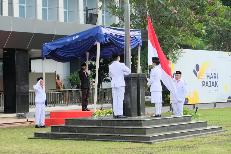 Direktur Jenderal Pajak Suryo Utomo memimpin pelaksanaan upacara bendera untuk memperingati Hari Pajak 2023 di kantor pusat Direktorat Jenderal Pajak, Jakarta (Jumat, 14/7).