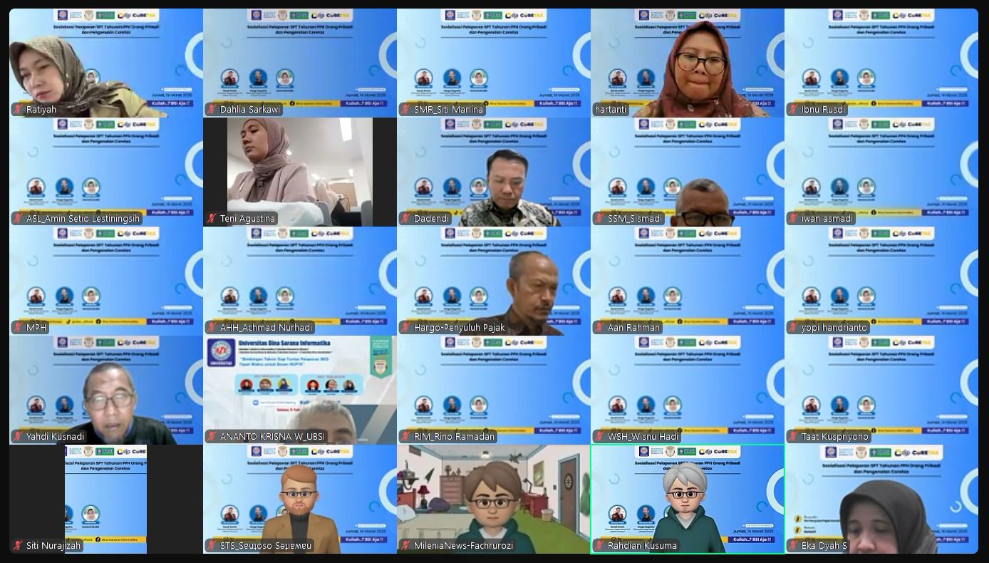 Kantor Wilayah Direktorat Jenderal Pajak (Kanwil DJP) Jakarta Khusus kembali menggelar kegiatan pendampingan pengisian Surat Pemberitahuan (SPT) Tahunan bagi sekitar 300 dosen dan staf Universitas Bina Sarana Informatika (UBSI) melalui Zoom Meeting (Jumat, 14/3). Program ini bertujuan untuk memberikan edukasi dan kemudahan dalam proses pelaporan pajak, terutama bagi wajib pajak yang masih mengalami kendala teknis atau administrasi.