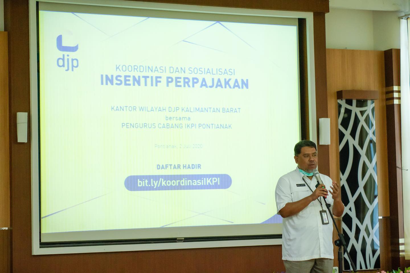 Kantor Wilayah DJP Kalimantan Barat melakukan sosialisasi tentang Insentif Pajak untuk Wajib Pajak Terdampak Pademi Covid-19 kepada Pengurus Ikatan Konsultan Pajak Indonesia (IKPI) Cabang Pontianak, bertempat di ruang Aula Kanwil DJP Kalbar, Kota Pontianak (Kamis, 02/07). Tujuan yang akan dicapai dengan adanya sosialisasi ini adalah optimalisasi pemanfaatan insentif pajak khususnya bagi wajib pajak yang terkena imbas pandemi Covid-19.