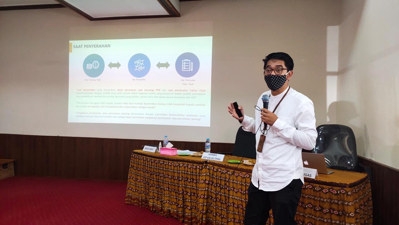 Narasumber menyampaikan materi mengenai PMK 220/PMK.03/2020 tentang Tata Cara Penghitungan dan Pemungutan Pajak Pertambahan Nilai atas Penyerahan Liquefied Petroleum Gas (LPG) Tertentu. Informasi yang disampaikan seputar latar belakang peraturan PMK 220/PMK.03/2020, aspek perpajakan, serta tata cara penghitungan dan pemungutan LPG tertentu.