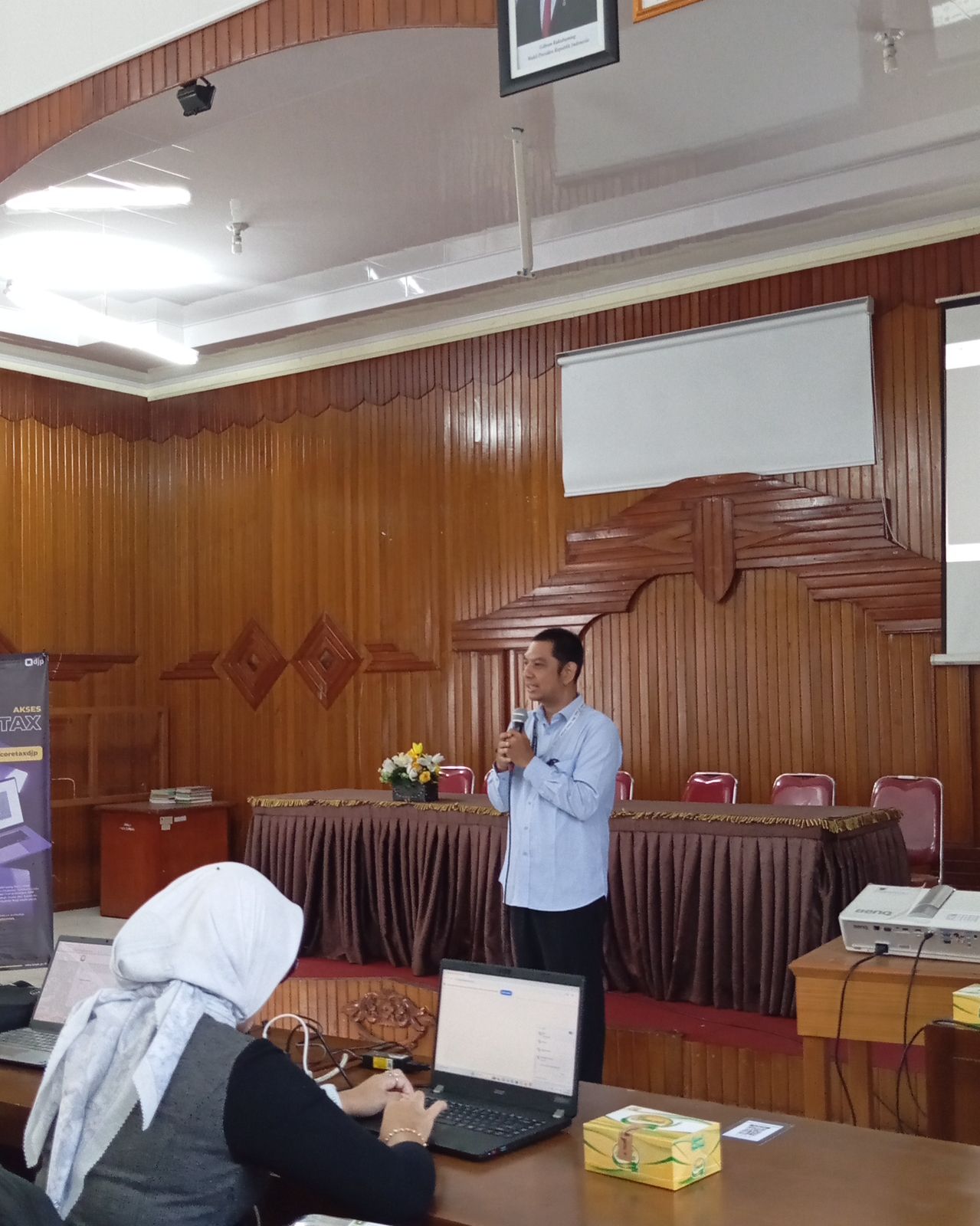 Materi teknis disampaikan oleh penyuluh pajak, Rico Satria Adipradana. Ia menjelaskan secara rinci tahapan aktivasi akun Coretax DJP, penggunaan kode otorisasi (sertifikat elektronik), hingga praktik langsung pelaporan SPT Tahunan. Peserta juga dibimbing mengantisipasi kendala umum, seperti validasi data dan pengisian bukti potong agar proses pelaporan berjalan lancar.