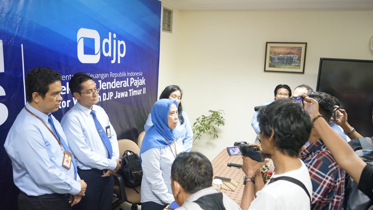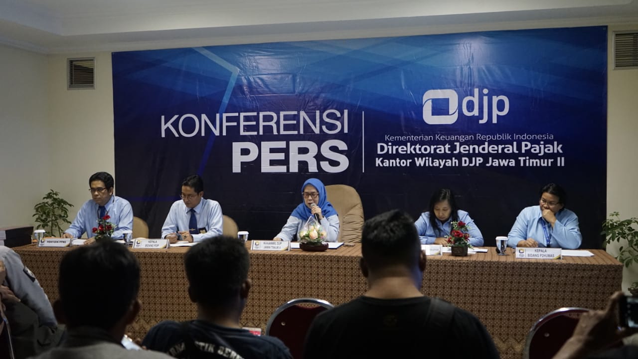 Kantor Wilayah Direktorat Jenderal Pajak (DJP) Jawa Timur II menggelar konferensi pers terkait penyerahan dua tersangka pidana pajak ke Kantor Kejaksaan Negeri Sidoarjo, bertempat di Ruang VIP Aula Kanwil DJP Jatim II (Rabu, 29/1). Kepala Kanwil DJP Jatim II Lusiani didampingi Kepala Bidang Bidang Pemeriksaan, Penagihan, Intelijen, dan Penyidikan Irawan, Kepala KPP Pratama Sidoarjo Selatan Ayu Norita Wuryansari, Kepala Bidang P2Humas Nyoman Ayu Ningsih serta Penyidik PNS Tulus Untung Sumbayak menyampaikan keterangan kepada 26 wartawan yang hadir untuk meliput konferensi pers tersebut.