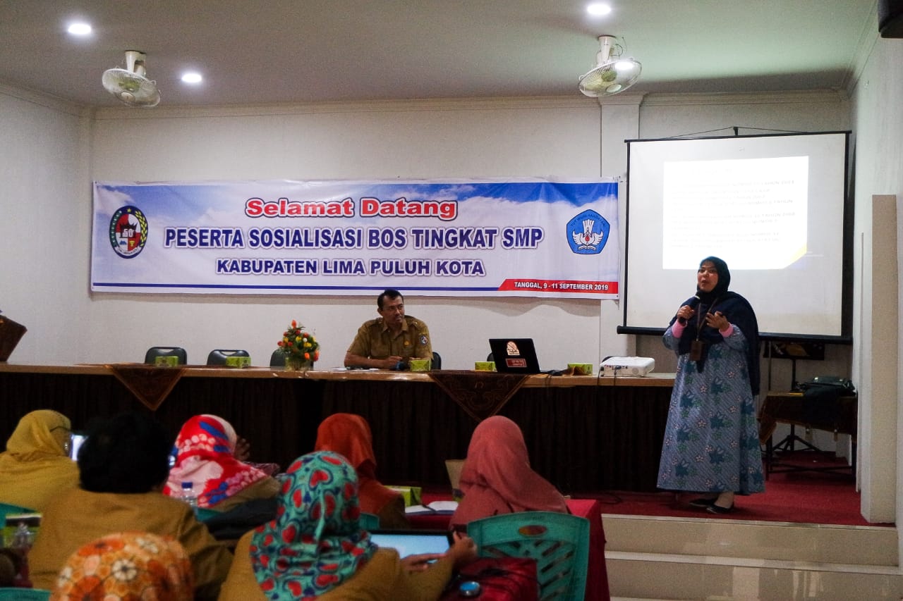 Kegiatan Sosialisasi Bendahara Sekolah Menengah Pertama (SMP) yang diadakan di Aula Hotel Sago Bungsu I, Jalan Raya Tanjung Pati KM7, Kecamatan Harau (10/9). Sosialisasi ini merupakan bentuk kerjasama dengan Dinas Pendidikan dan Kebudayaan Kab. Lima Puluh Kota dalam pengelolaan Dana BOS SMP se-Kecamatan Harau. Peserta sosialisasi sendiri merupakan Bendahara di SMP se-Kecamatan Harau, para peserta yang hadir terlihat aktif dan responsif dalam mengikuti kegiatan sosialisasi.