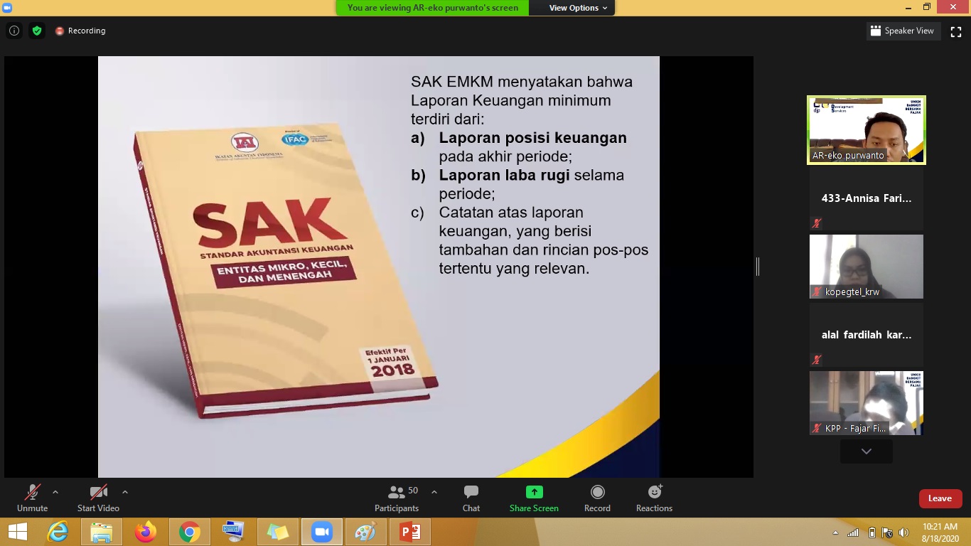 Materi yang dipaparkan dalam kegiatan ini yaitu mengenai penyusunan laporan keuangan bagi WP UMKM, serta disampaikan pula materi tentang insentif pajak yang dapat dimanfaatkan oleh WP UMKM dalam masa pandemi Covid-19 sesuai dengan PMK-86/PMK.03/2020. Latar belakang diselenggarakannya kegiatan ini yaitu masih banyaknya WP UMKM yang belum tertib dalam melaporkan Surat Pemberitahuan (SPT) Tahunan.
