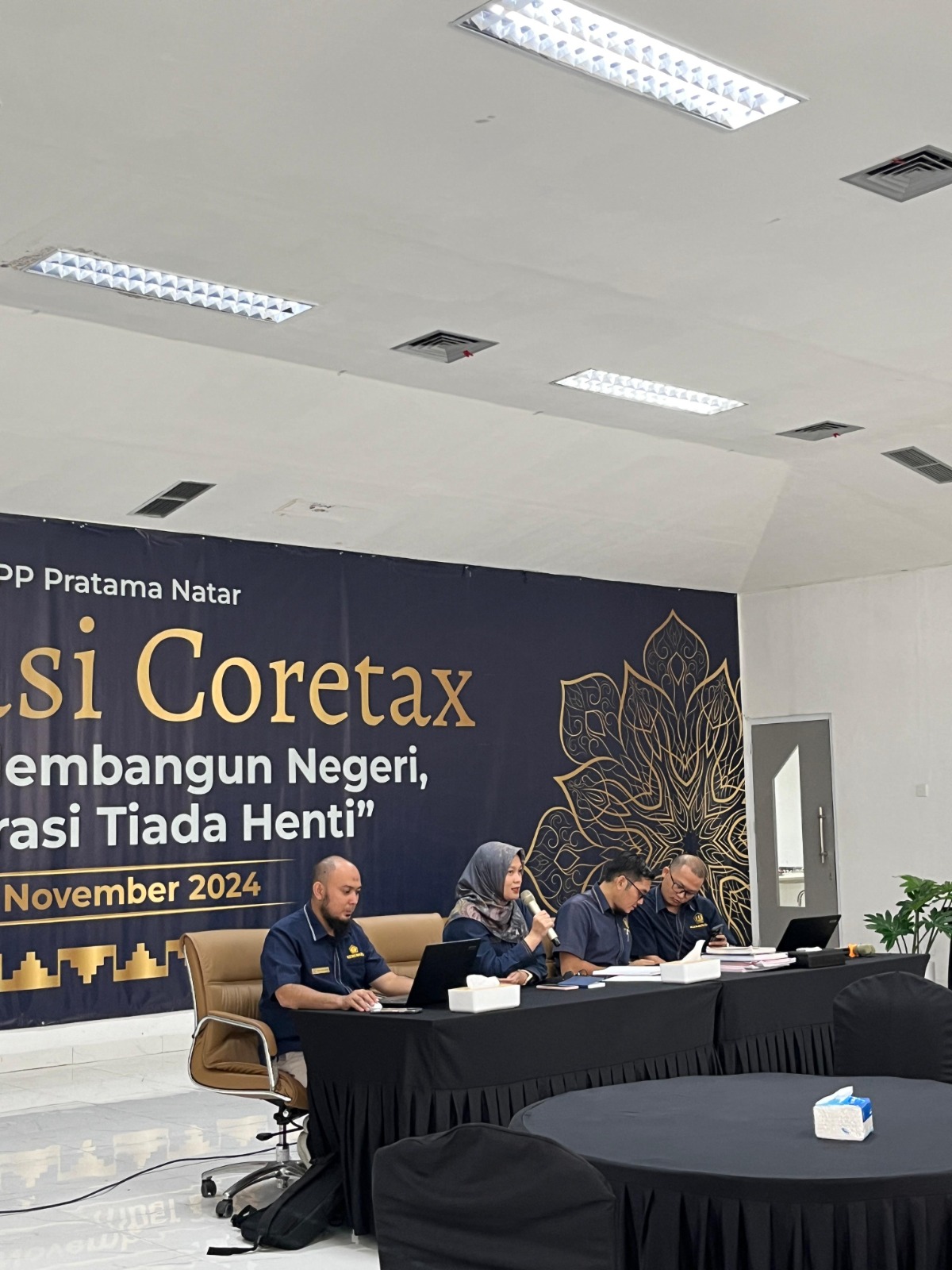 Kantor Pelayanan Pajak (KPP) Pratama Natar bersama dengan Kantor Wilayah Direktorat Jenderal Pajak (Kanwil DJP) Bengkulu dan Lampung serta Kantor Pelayanan Perbendaharaan Negara (KPPN) Bandar Lampung mengadakan audiensi terkait implementasi Coretax DJP dalam pelaksanaan hak dan kewajiban perpajakan bagi instansi pemerintah yang diselenggarakan di Aula KPP Pratama Natar, Kabupaten Lampung Selatan (Rabu, 12/2).