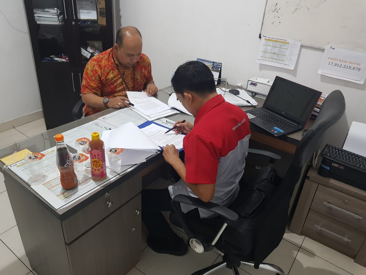 Kantor Pelayanan, Penyuluhan dan Konsultasi Pajak (KP2KP) Tanjung Selor mendatangi kantor JNE di Bulungan (Jumat, 26/11). Kunjungan tersebut dilakukan untuk melaksanakan evaluasi atas kerja sama yang telah dilakukan selama ini khususnya terkait pengiriman berkas dan evaluasi penyampaian surat. Dalam kunjungannya beliau disambut Aziz selaku perwakilan JNE Bulungan dalam ruangan kerjanya.