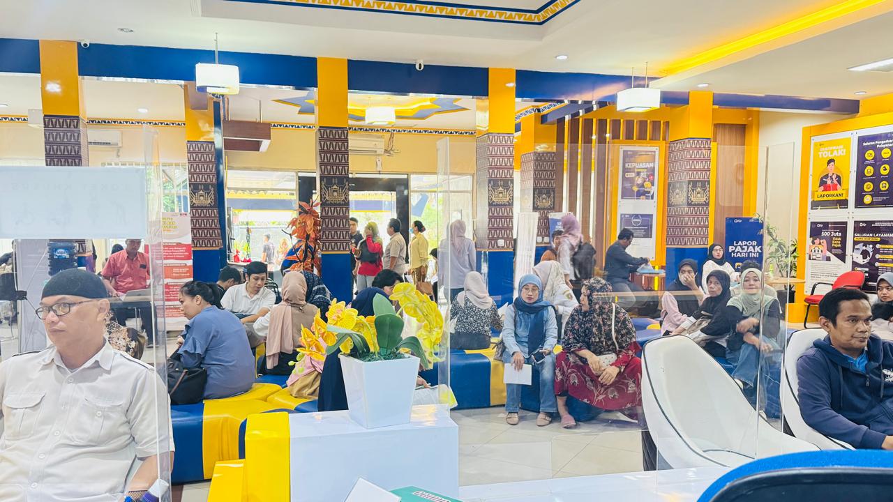 Petugas pajak terlihat aktif membantu wajib pajak dalam proses administrasi, memberikan penjelasan terkait prosedur perpajakan, serta membimbing pengisian formulir yang dibutuhkan. Beberapa wajib pajak juga memanfaatkan mesin antrean elektronik untuk mendapatkan nomor layanan sesuai dengan jenis permohonan yang diajukan.