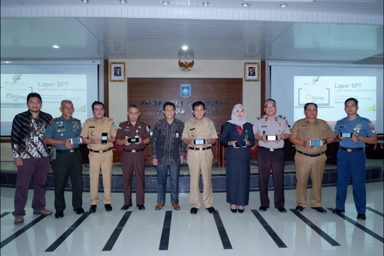 Bupati Bangka Tengah Ibnu Saleh, Wakil Bupati Yulianto Satin, dan seluruh pejabat Forkopimda melakukan pelaporan SPT Tahunan secara e-Filing dalam acara Pekan Panutan yang diselenggarakan oleh KPP Pratama Bangka dan KP2KP Koba di Ruang VVIP Pemkab Bangka Tengah (Selasa, 11/2).