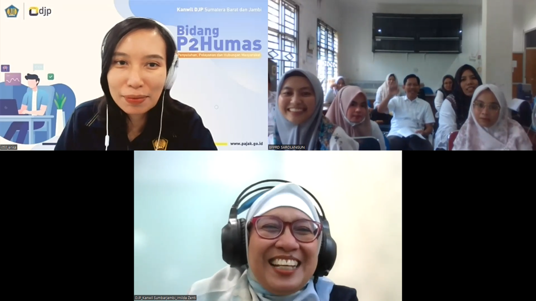 Kantor Wilayah DJP Sumatera Barat dan Jambi mengadakan Bimbingan Teknis Pengelolaan Pajak Daerah melalui daring Zoom dengan peserta bimbingan dari Badan Pengelola Pajak dan Retribusi Daerah (BPPRD) Kabupaten Sarolangun (Rabu, 13/3). Bimtek ini merupakan hasil dari perjanjian kerja sama optimalisasi pemungutan pajak pusat dan pajak daerah (PKS OP4D) antara Direktorat Jenderal Pajak, Direktorat Jenderal Perimbangan Keuangan, dan Pemerintah Daerah Kabupaten Sarolangun.
