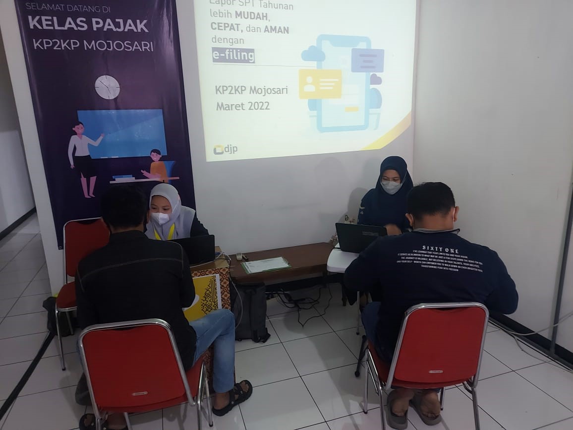 Kantor Pelayanan, Penyuluhan, dan Konsultasi Perpajakan (KP2KP) Mojosari mengadakan kelas pajak secara luring dengan tema Panduan Pengisian SPT Tahunan Melalui e-Filing di KP2KP Mojosari, Kab. Mojokerto (Selasa, 29/3).