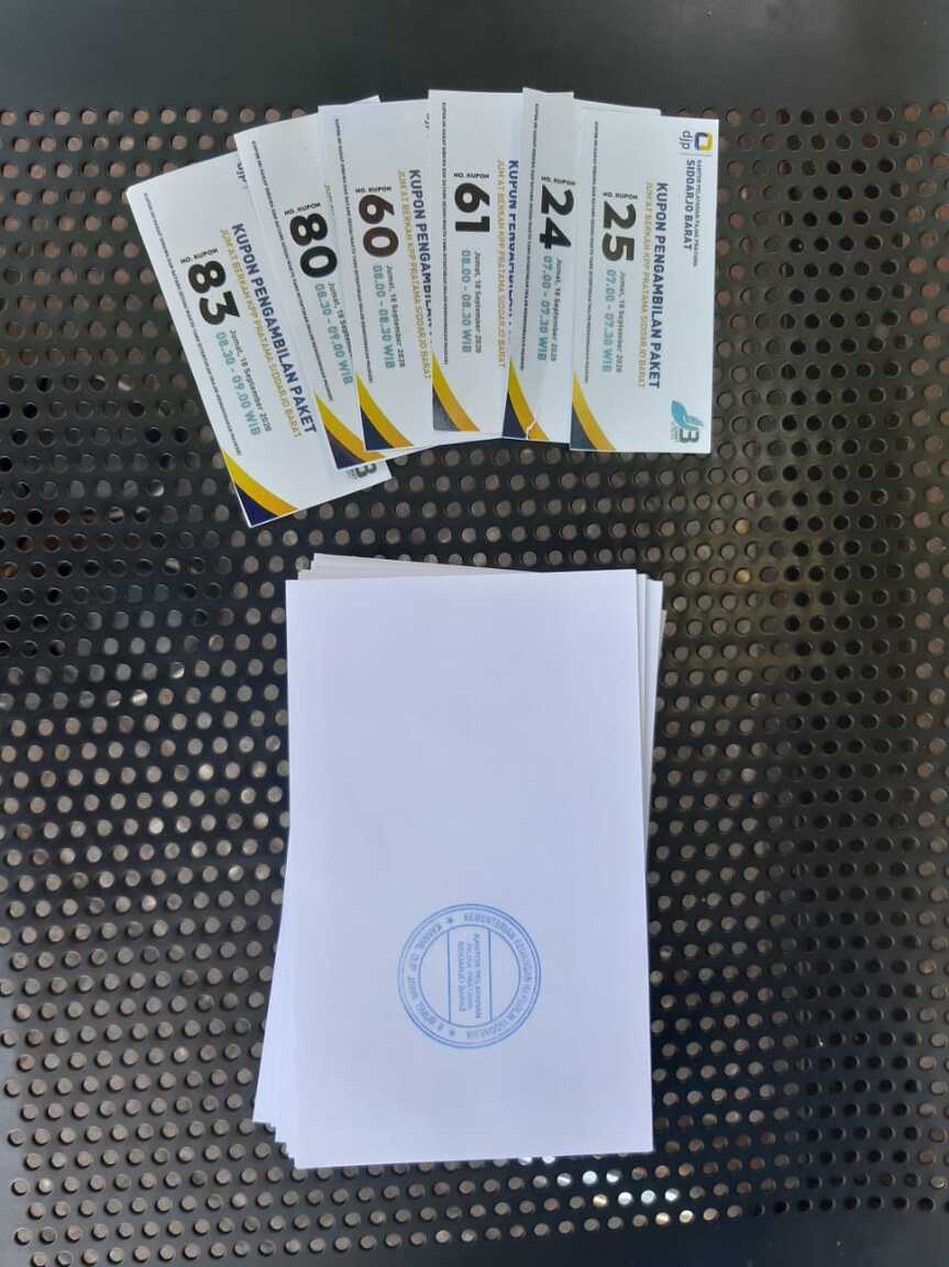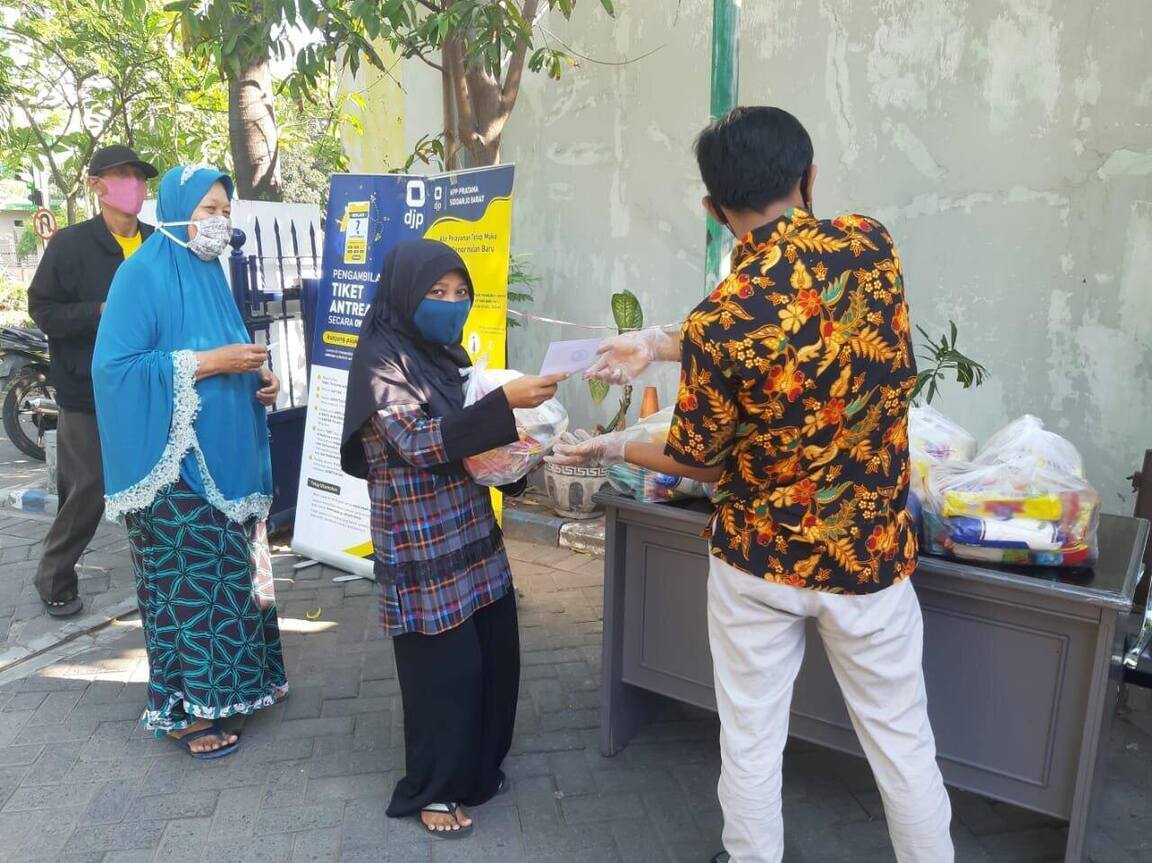 Sehari sebelum pelaksanaan kegiatan, pegawai KPP Pratama Sidoarjo Barat membagikan kupon kepada warga sekitar. Pada kupon tertulis jam pengambilan paket sembako guna menghindari penumpukan warga pada jam tertentu.