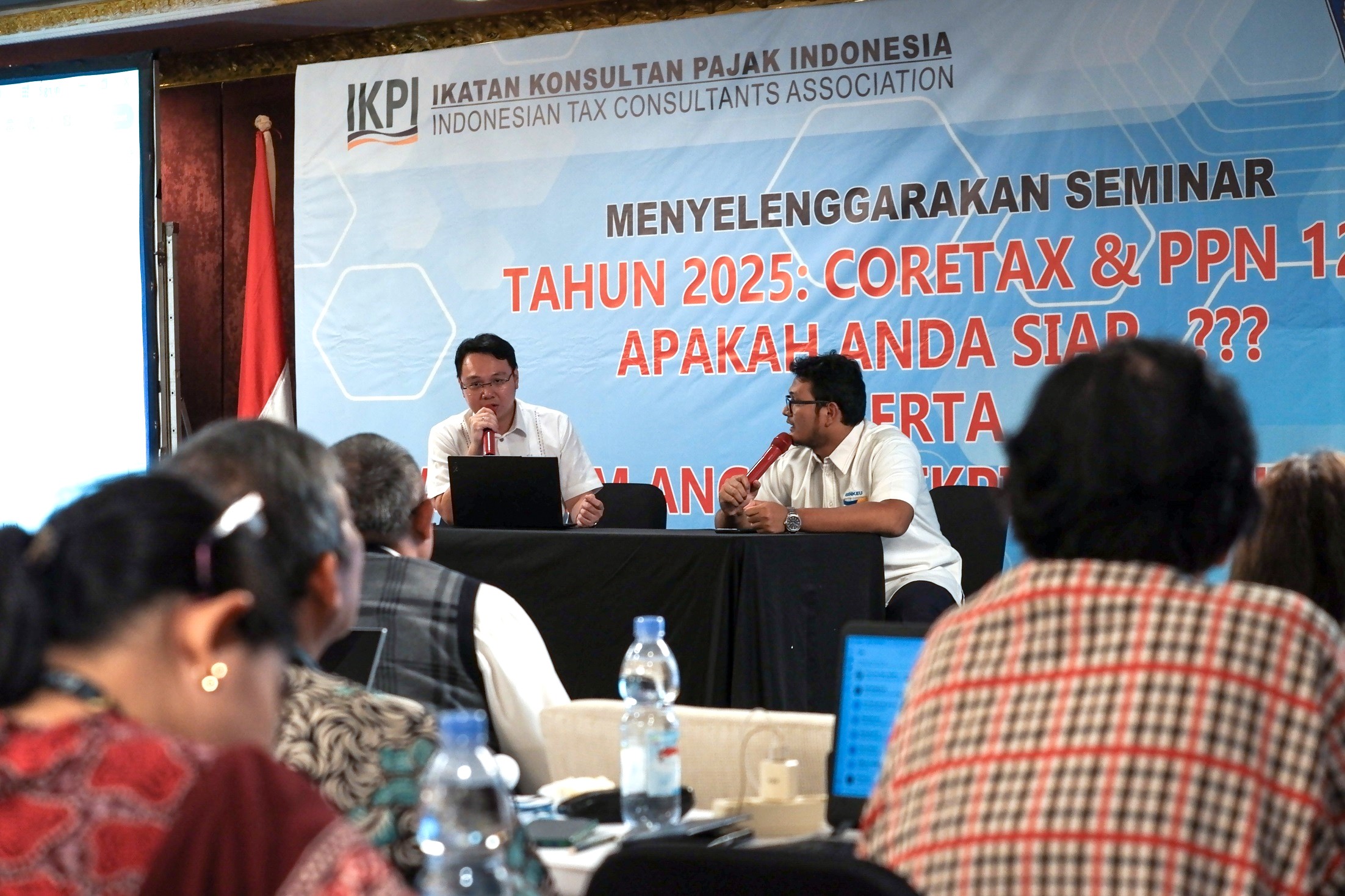 Seminar yang berlangsung pukul 09.00 sampai 16.00 WIB ini, diikuti 150 anggota IKPI Cabang Jakarta Utara. Materi yang disampaikan Tim Penyuluh Pajak, Roberto Ritonga, Novi Trinugroho Hastuti, dan Arif Muhammad Najib, mengenai Coretax DJP dan Pajak Pertambahan Nilai (PPN) 12%.