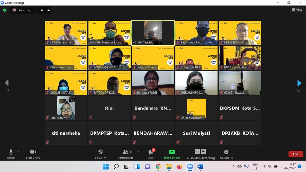 Kantor Pelayanan Pajak (KPP) Pratama Serang Barat melaksanakan Kegiatan Kelas Pajak online melalui aplikasi Zoom Meeting Pelaporan SPT Tahunan bagi para pegawai di seluruh lingkungan Instansi Pemerintah Kota Serang, Kota Serang (Selasa, 15/02).