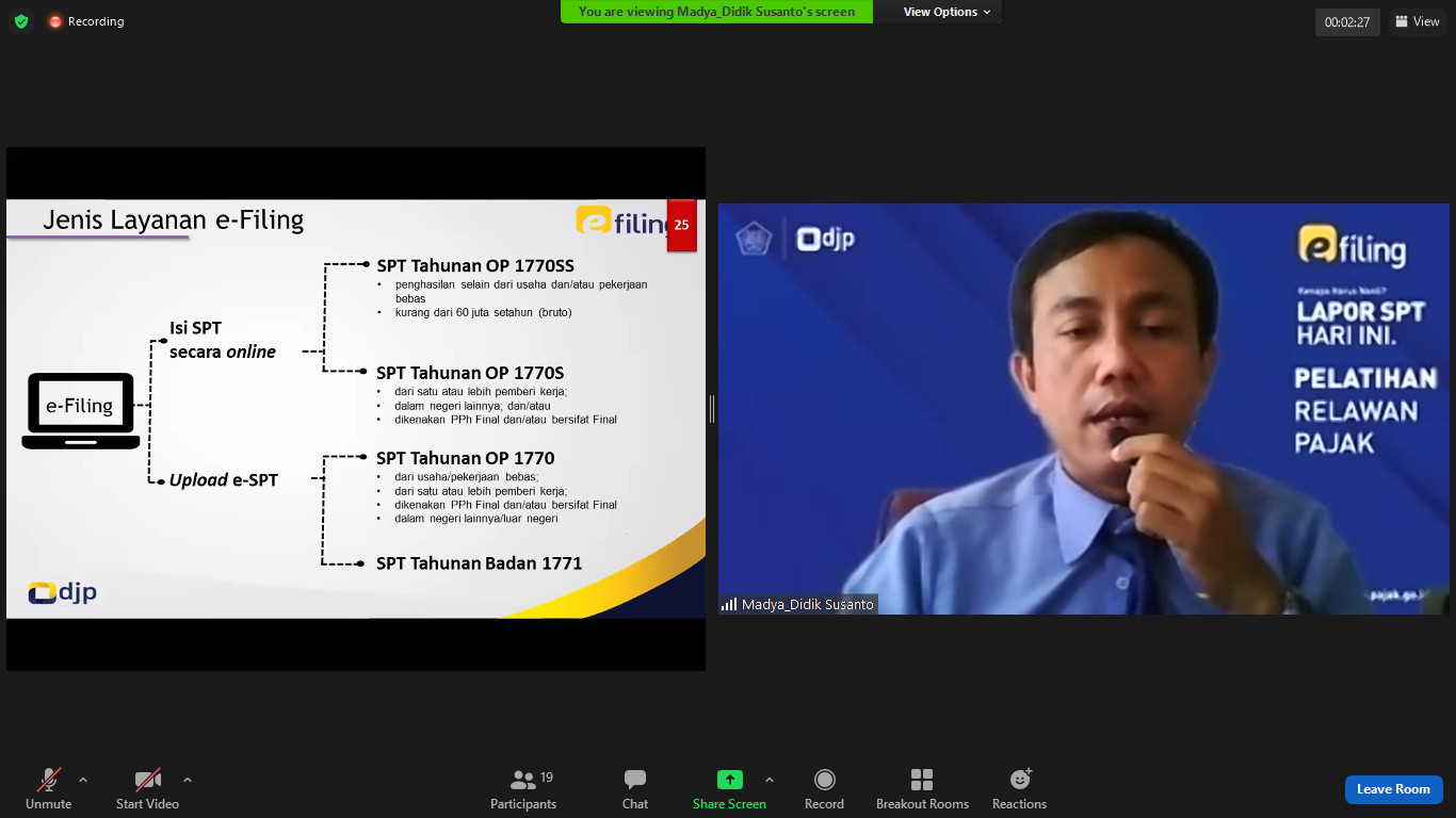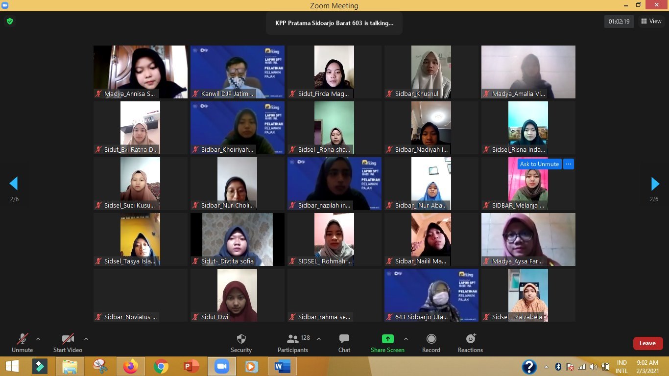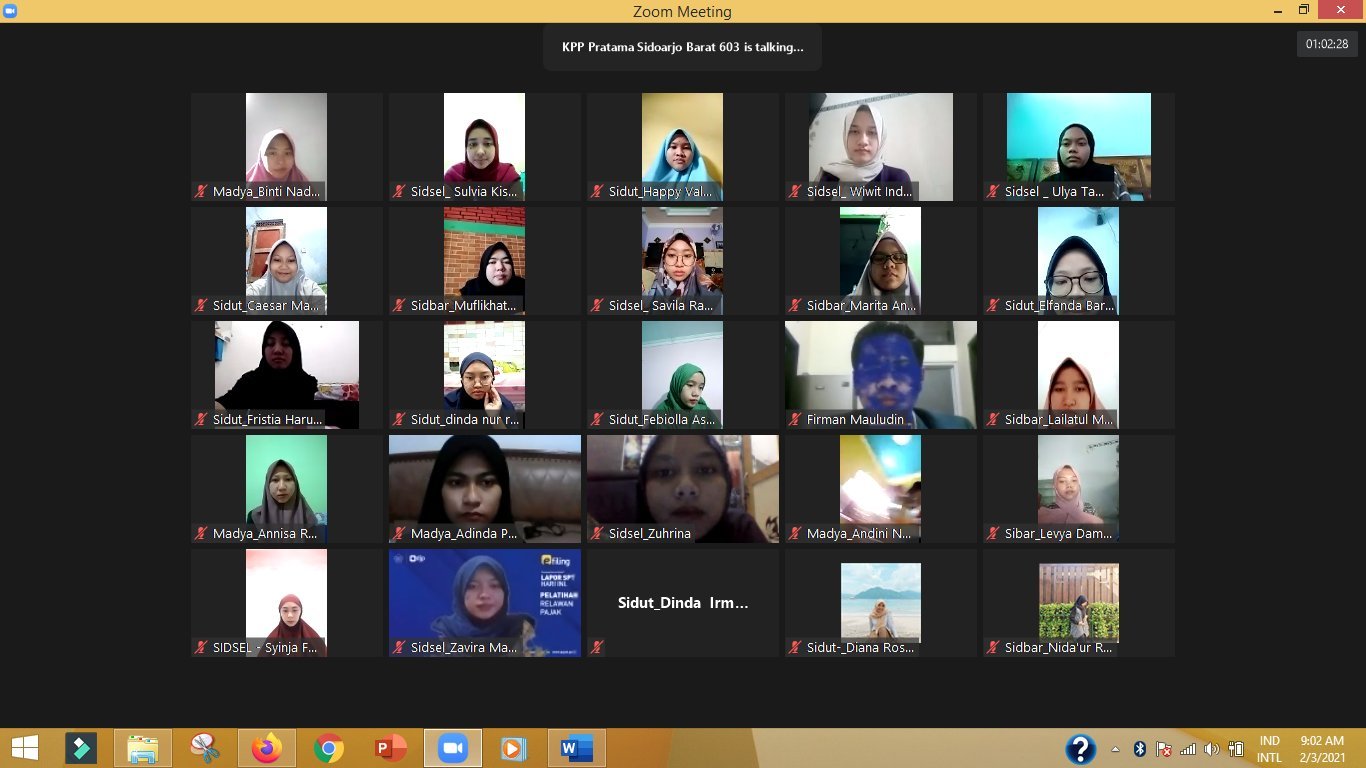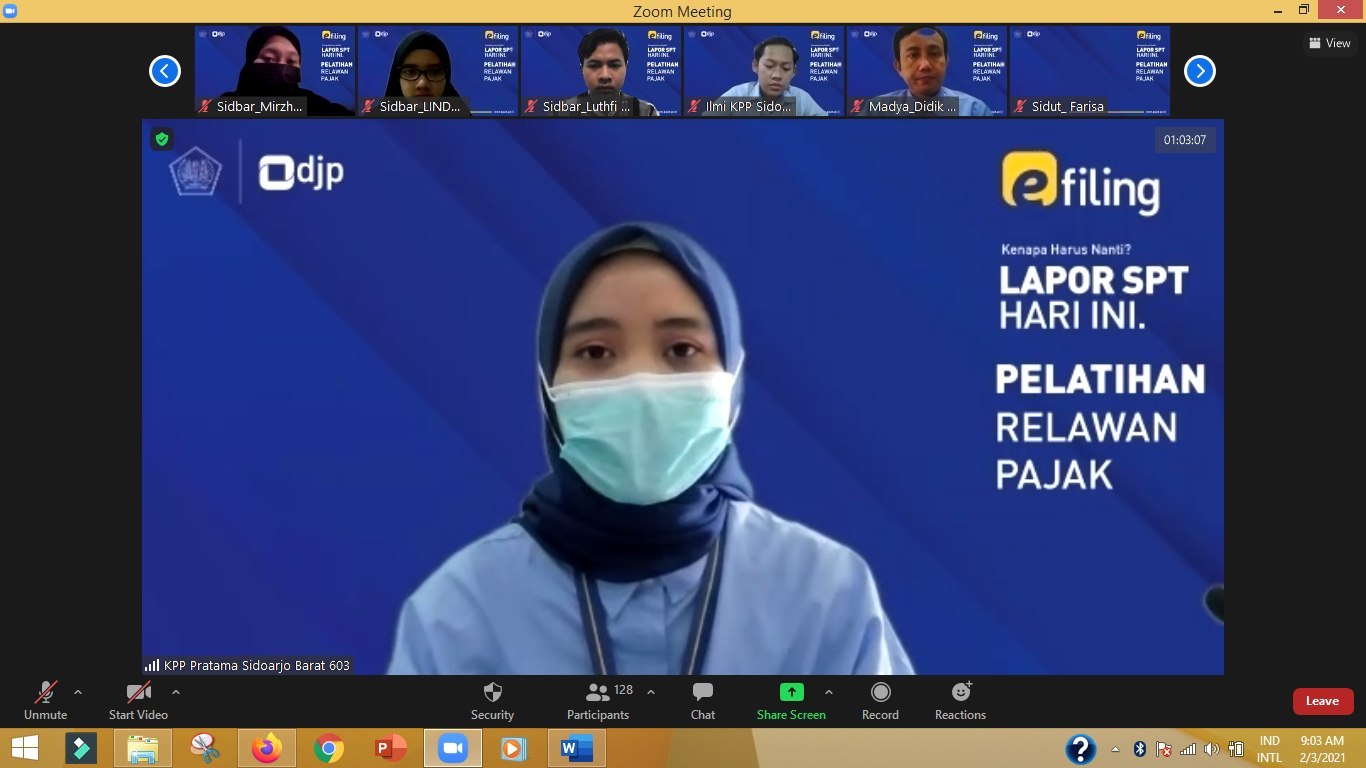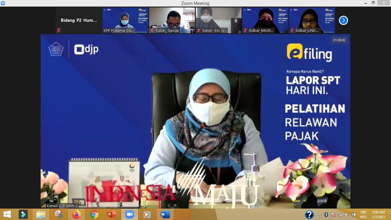 Kanwil DJP Jawa Timur II bekerja sama dengan organisasi mitra Universitas Muhammadiyah Sidoarjo (Umsida) menyelenggarakan Pelatihan Relawan Pajak secara daring melalui zoom di Sidoarjo (Rabu, 3/2).