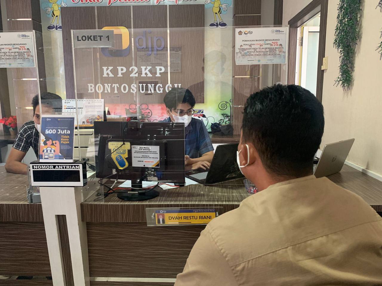 Pegawai Kantor Pelayanan, Penyuluhan, dan Konsultasi Perpajakan (KP2KP) Bontosunggu memberikan pelayanan dan konsultasi terhadap salah seorang wajib pajak yang ingin memanfaatkan Program Pengungkapan Sukarela (PPS) di KP2KP Bontosunggu (Kamis, 30/06).