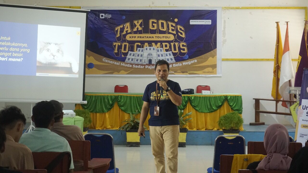 Kantor Pelayanan Pajak (KPP) Pratama Tolitoli menyelenggarakan Tax Goes to Campus (TGTC) di Kampus Universitas Madako Tolitoli (Kamis, 9/6). Kegiatan ini diadakan di Kampus Universtias Madako yang beralamatkan di Jl. Madako No. 1, Kelurahan Baru, Kecamatan Baolan, Kabupaten Tolitoli.