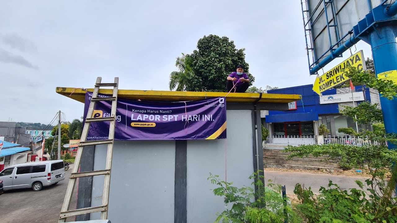 Kepala Seksi Ekstensifikasi dan Penyuluhan KPP Pratama Batam Utara Thomas Rusdwianto bersama Tim melakukan pemasangan spanduk himbauan pelaporan SPT Tahunan di Polsek Batu Ampar, Batam (Rabu, 27/1).