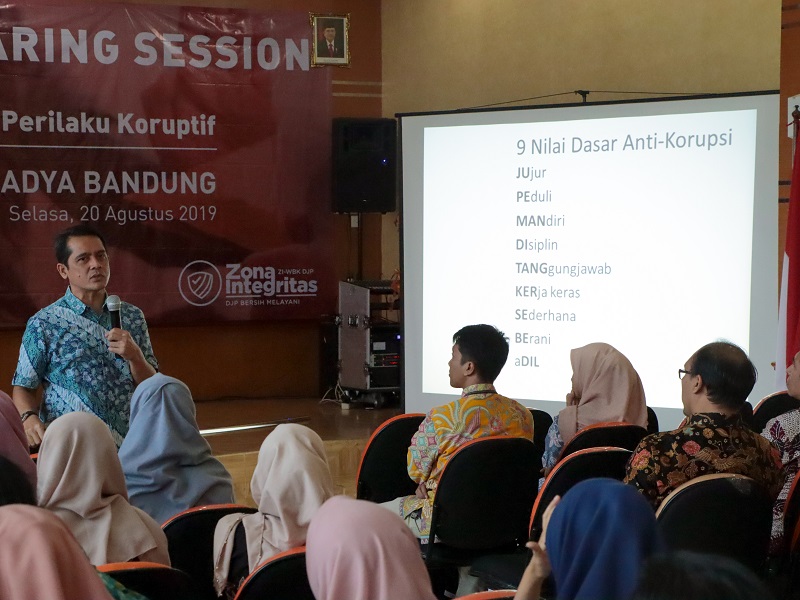 KPP Madya Bandung menghadirkan Pakar Hukum Pidana dari Universitas Indonesia (UI) Gandjar Laksmana Bonaprapta, S.H., M.H. untuk menjadi narasumber dalam acara Sharing Session yang bertajuk ‘Indonesia Maju, Bebas dari Perilaku Korupsi’ di Aula KPP Madya Bandung (Selasa, 20/8).