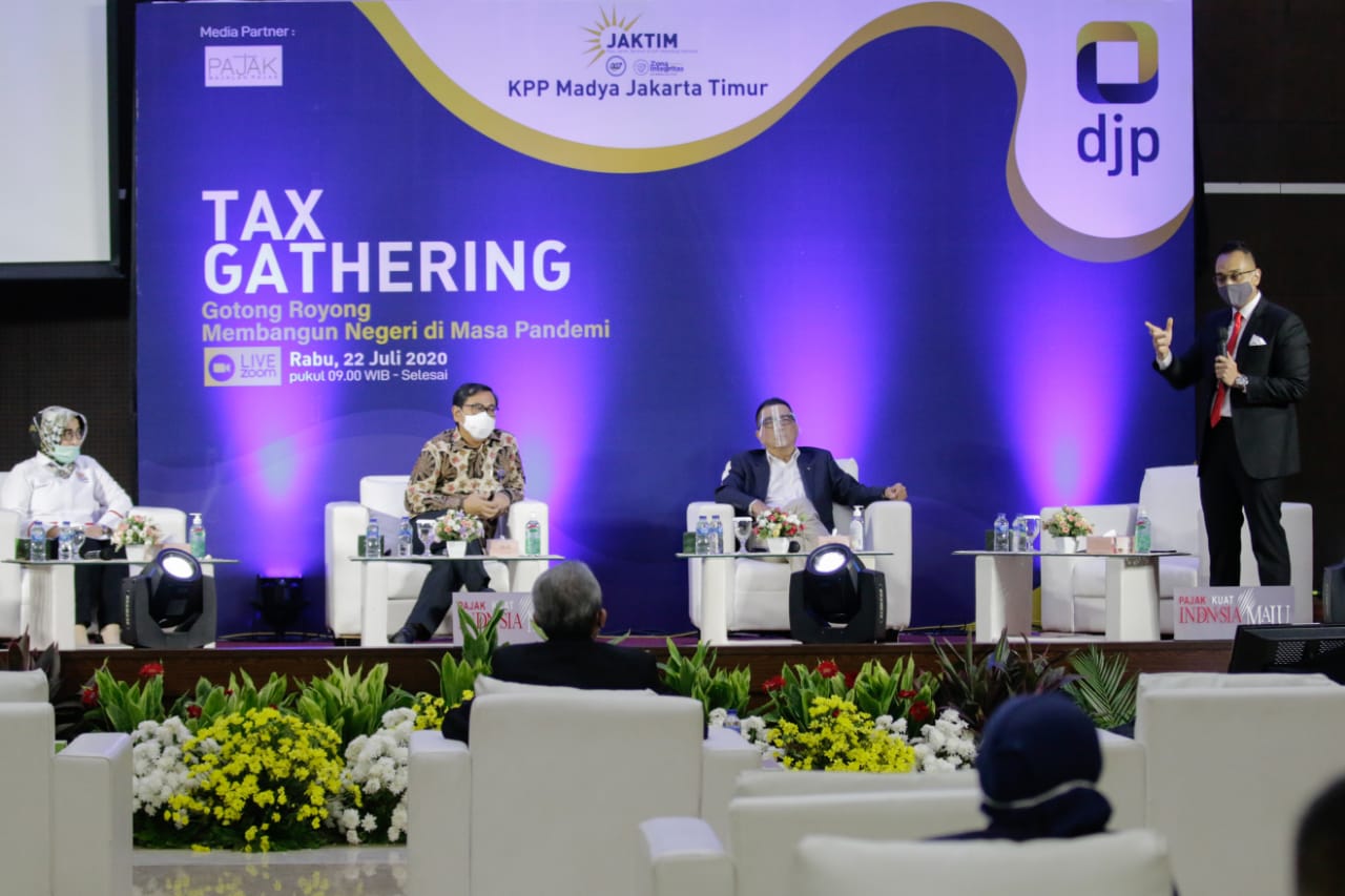 Kantor Pelayanan Pajak (KPP) Madya Jakarta Timur menggelar acara Tax Gathering dengan mengusung tema “Gotong Royong Membangun Negeri di Masa Pandemi” di Aula Lt. 3 Gedung Pajak Madya, Jakarta Pusat (Rabu, 22/7). Wajib pajak yang diundang dalam kegiatan Tax Gathering mengikuti melalui video conference. Acara Tax Gathering diisi dengan seminar perpajakan yang dipandu oleh Aiman Witjaksono (TV News Anchor) dengan narasumber Staf Khusus Menteri Keuangan Yustinus Prastowo, Business and Communication Coach Helmi Yahya, dan Ketua Kadin DKI Jakarta Hj. Diana Dewi.