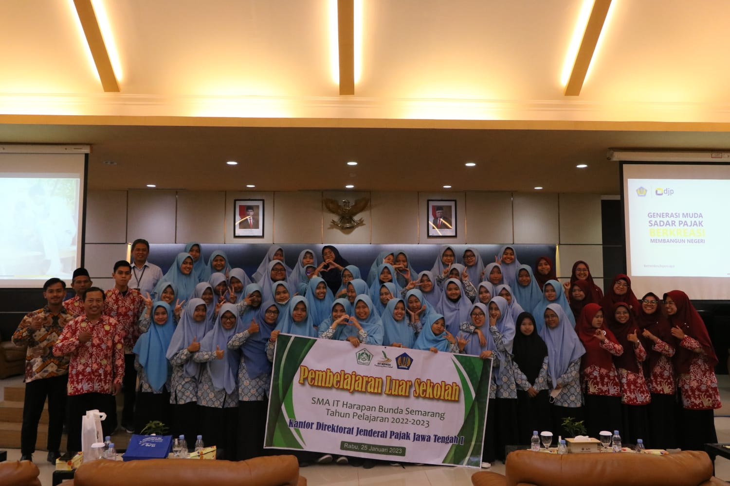 Kantor Wilayah Direktorat Jenderal Pajak ( Kanwil DJP) Jawa Tengah I menerima kunjungan dari Sekolah Menengah Atas (SMA) Islam Terpadu (IT) Harapan Bunda Semarang di Aula Lantai 7 Gedung Keuangan Negara (GKN) Semarang II, Semarang (Rabu, 25/1). Dalam kunjungan tersebut, Tim Penyuluh Kanwil DJP Jawa Tengah I yakni Ganung Harnawa dan Rizky Keroshinta menyampaikan pengetahuan perpajakan kepada 74 siswa beserta 13 guru pendamping.