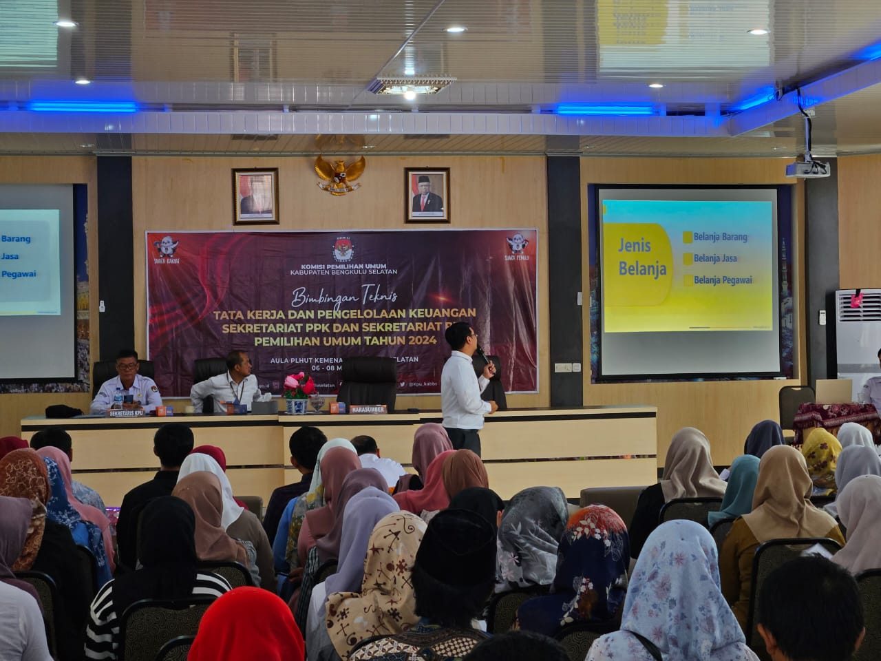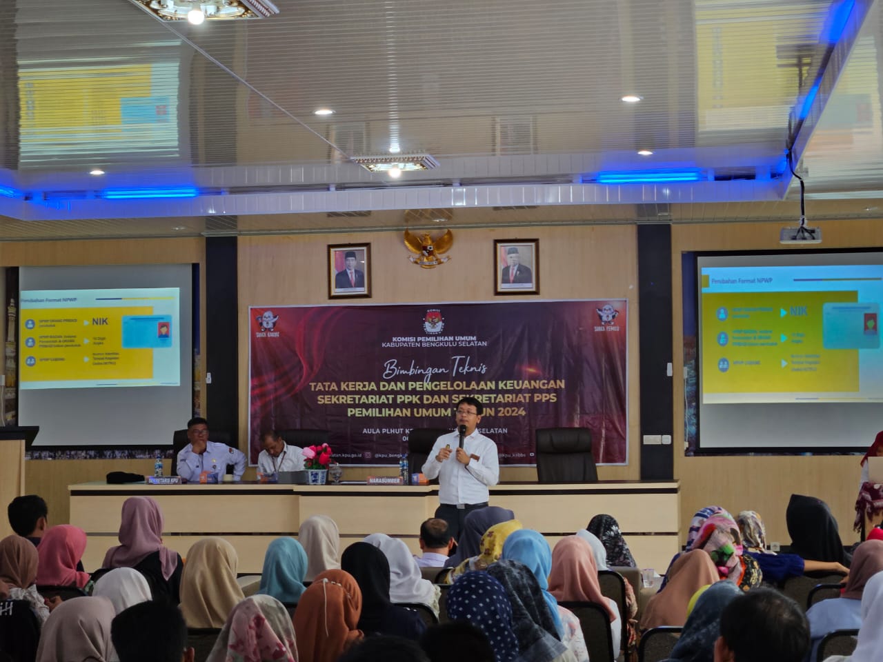 Tim Penyuluh Kantor Pelayanan Penyuluhan dan Konsultasi Perpajakan (KP2KP) Manna bersama Tim Penyuluhan Kantor Pelayanan Pajak (KPP) Pratama Bengkulu Dua menjadi narasumber dalam Bimbingan Teknis (Bimtek) Tata Kerja dan Pengelolaan Keuangan Sekretariat Panitia Pemilihan Kecamatan (PPK) dan Sekretariat Panitia Pemungutan Suara (PPS) Pemilihan Umum (Pemilu) Tahun 2024 yang diselenggarakan oleh Komisi Pemilihan Umum (KPU) Kabupaten Bengkulu Selatan (Senin, 6/3).