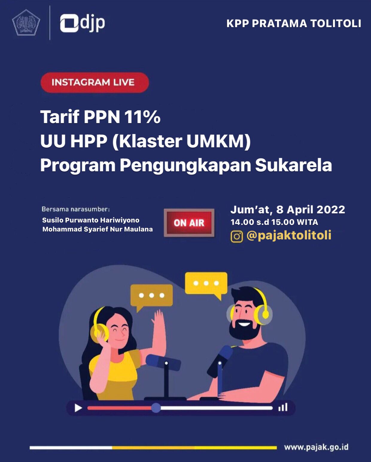 Kantor Pelayanan Pajak (KPP) Pratama Tolitoli mengadakan sosialisasi terkait Undang-Undang Nomor 7 tahun 2021 tentang Harmonisasi Peraturan Perpajakan (UU HPP) melalui akun media sosial instagram @pajaktolitoli di KPP Pratama Tolitoli, Kabupaten Tolitoli (Jumat, 8/4). Kegiatan ini bertujuan untuk memberikan pemahaman kepada wajib pajak di kabupaten Tolitoli terkait UU HPP.