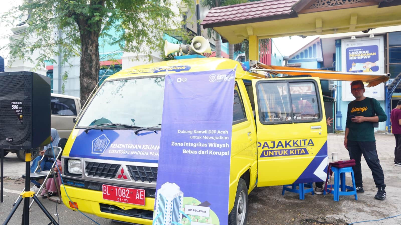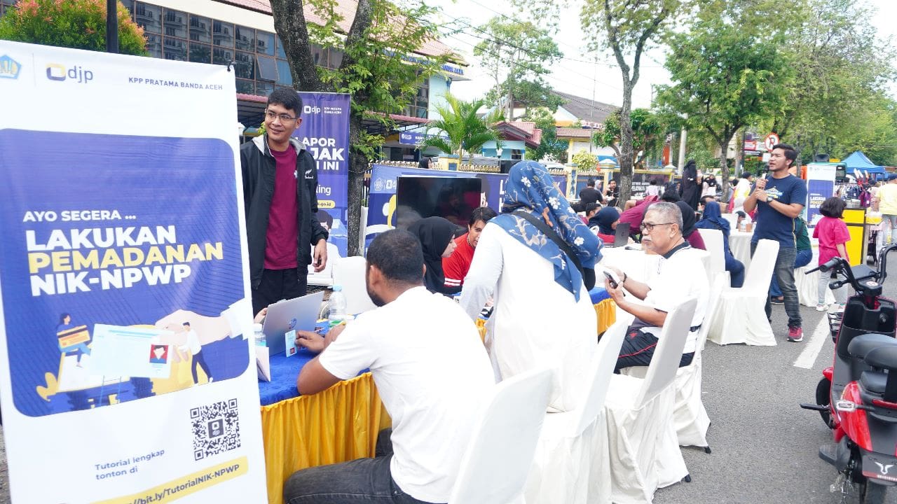 Kantor Wilayah Direktorat Jenderal Pajak (Kanwil DJP) Aceh bersama dengan Kantor Pelayanan Pajak (KPP) Pratama Banda Aceh menggelar Pojok Pajak dengan layanan asistensi Pemadanan Nomor Induk Kependudukan (NIK) sebagai Nomor Pokok Wajib Pajak (NPWP) dan pelaporan Surat Pemberitahuan (SPT) Tahunan yang berlangsung di Car Free Day (CFD) Banda Aceh (Minggu, 19/2). Dalam kegiatan ini, para Fungsional Penyuluh Pajak beserta pelaksana Kanwil DJP Aceh dan KPP Pratama Banda Aceh membantu wajib pajak memadankan NIK sebagai NPWP.