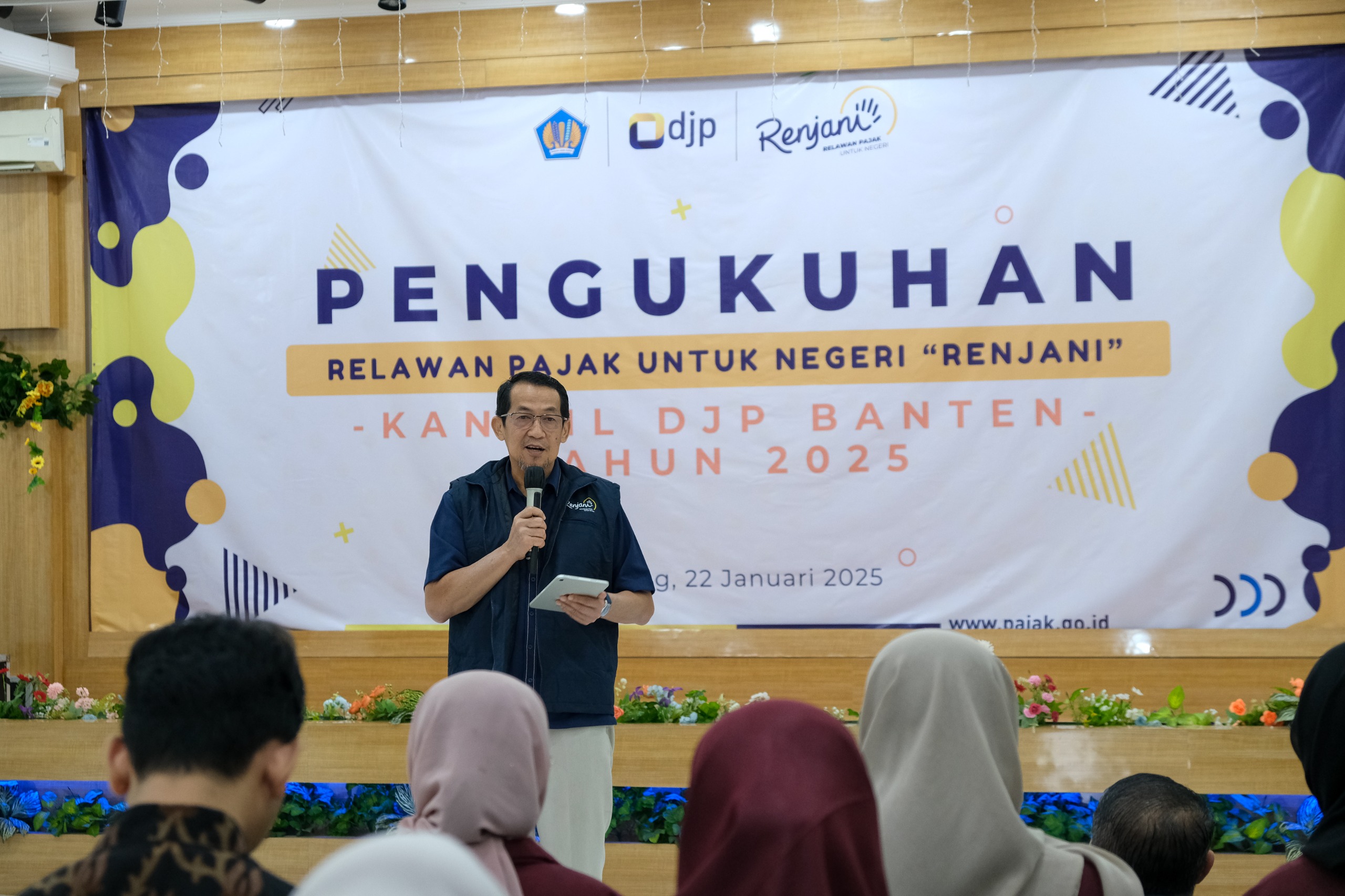 Kepala Kantor Wilayah Direktorat Jenderal Pajak (Kanwil DJP) Banten, Cucu Supriatna, resmi mengukuhkan sebanyak 704 Relawan Pajak Untuk Negeri (Renjani) Tahun 2025. Prosesi pengukuhan Renjani dilakukan secara hybrid, yaitu secara luring di Aula Krakatau Lantai 3 Kanwil DJP Banten dan daring melalui aplikasi Microsoft Teams (Rabu, 22/1).