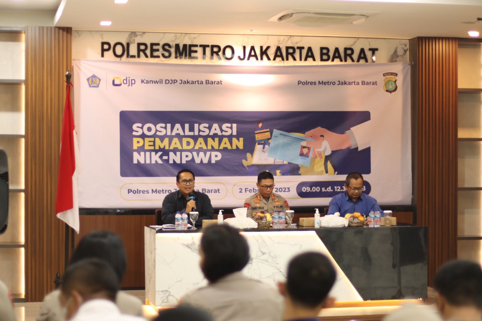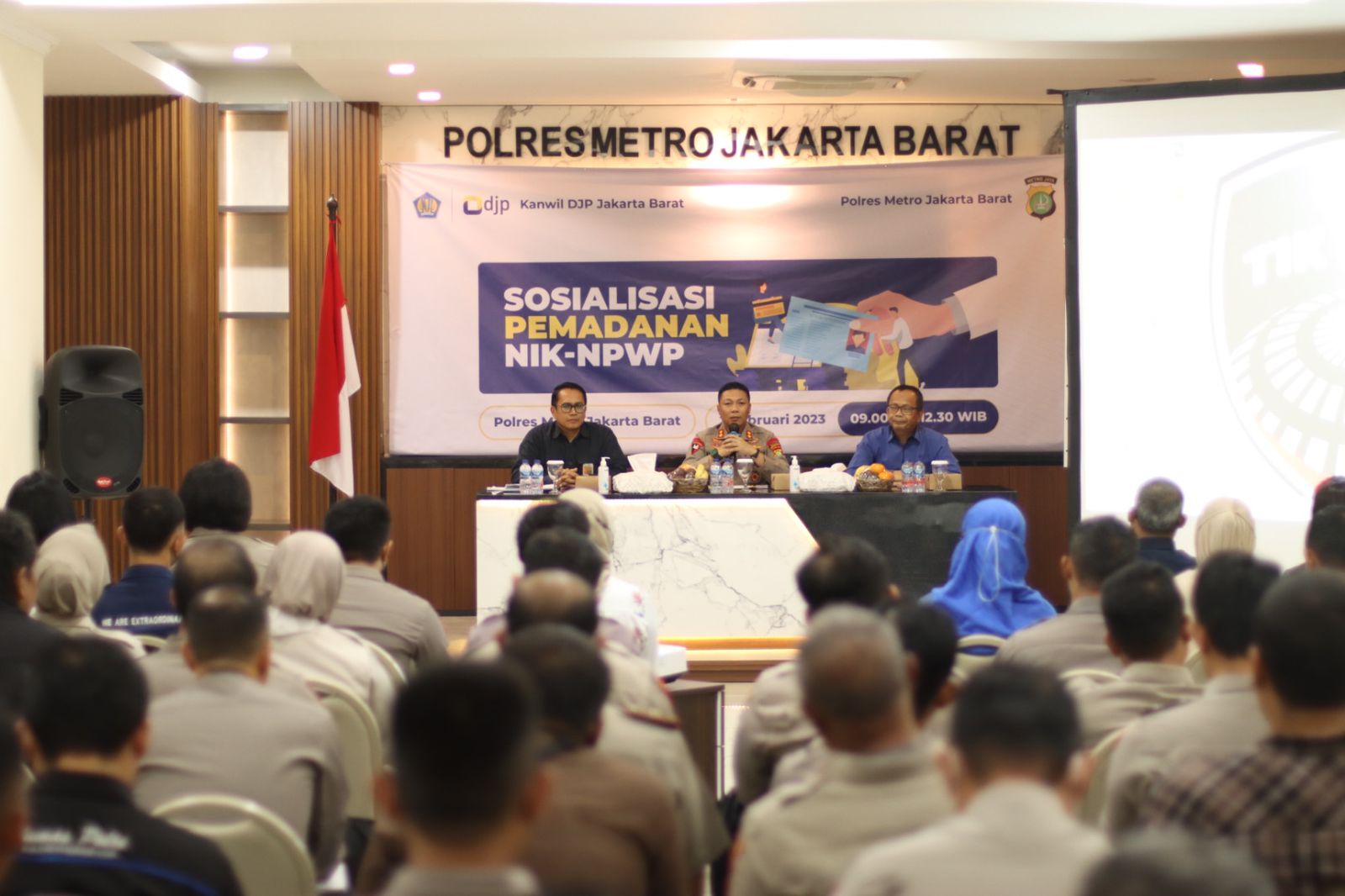 Kantor Wilayah Direktorat Jenderal Pajak (Kanwil DJP) Jakarta Barat menggelar kegiatan sosialisasi pemadanan Nomor Induk Kependudukan (NIK)-Nomor Pokok Wajib Pajak (NPWP) di Aula Lantai 2 Polres Metro Jakarta Barat (Kamis 2/3).