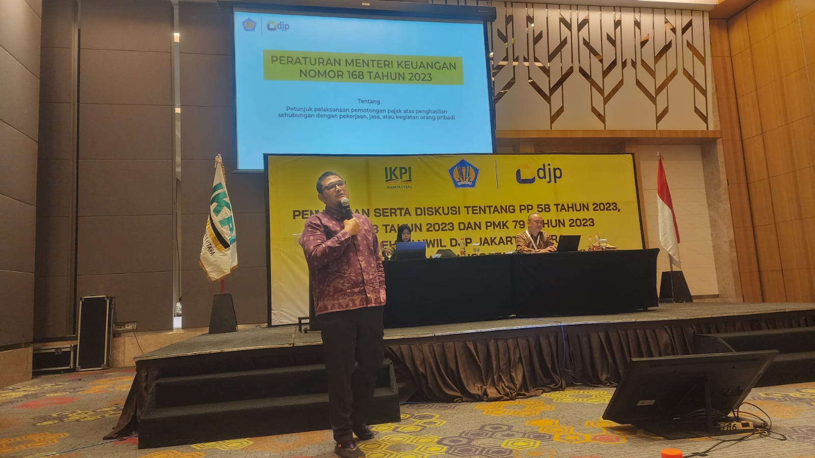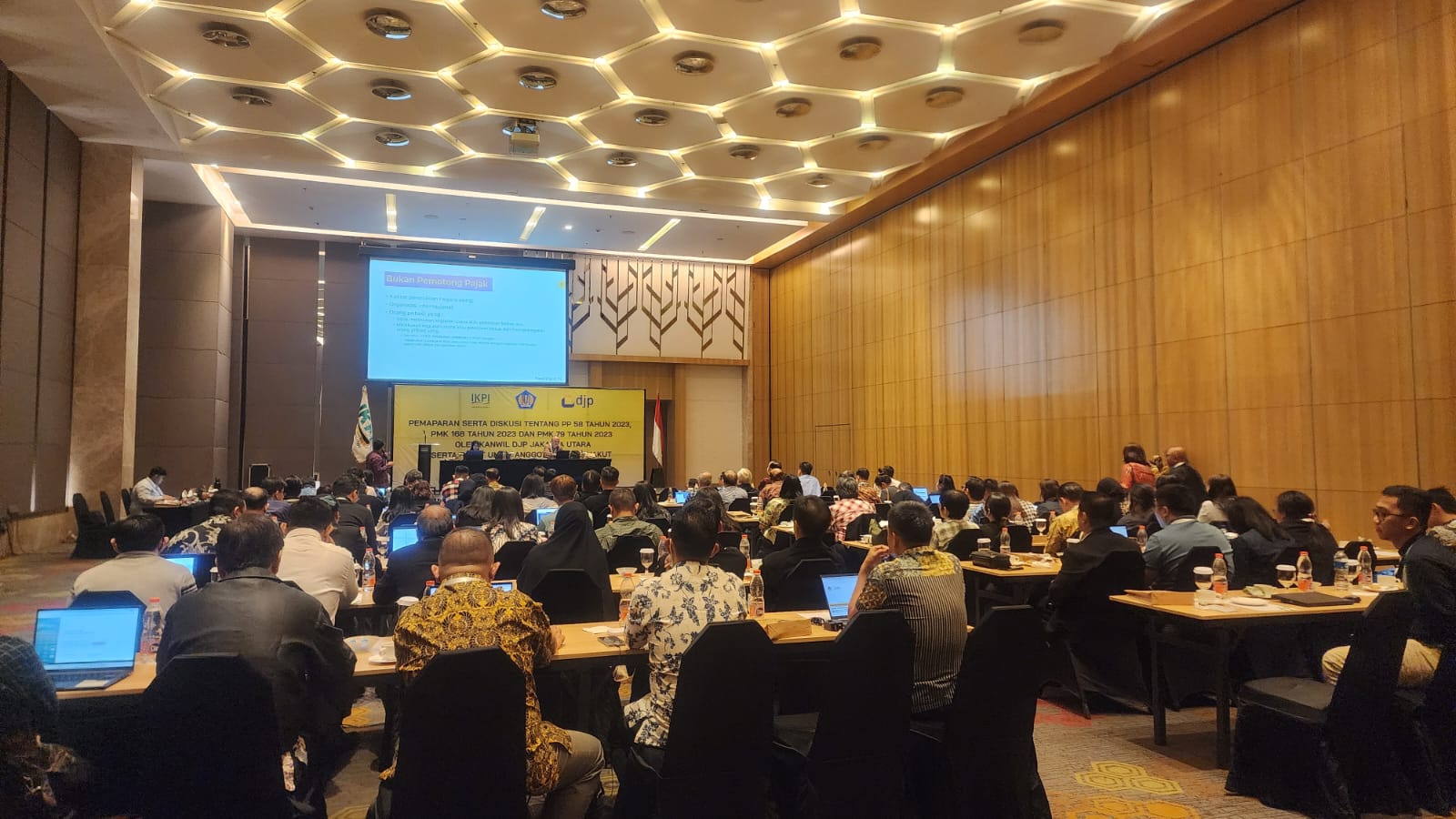 Kantor Wilayah Direktorat Jenderal Pajak (Kanwil DJP) Jakarta Utara bekerjasama dengan Ikatan Konsultan Pajak Indonesia (IKPI) Cabang Jakarta Utara mengadakan kegiatan Pemaparan Serta Diskusi tentang PP 58 tahun 2023, PMK 168 tahun 2023, dan PMK 79 tahun 2023 di Jakarta (Selasa, 16/1). Kegiatan dilaksanakan pukul 09.00 sampai 15.00 WIB, diikuti 90 anggota IKPI cabang Jakarta Utara dan dihadiri Ketua Departemen PPL dan Wakil Sekretaris IKPI Pusat serta Ketua IKPI cabang Jakarta Utara.
