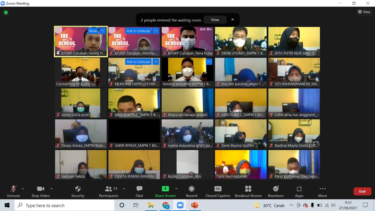 Kantor Pelayanan, Penyuluhan, dan Konsultasi Perpajakan (KP2KP) Caruban bersama Sekolah Menengah Pertama Negeri (SMPN) 1 Balerejo mengadakan acara Tax Goes To School (TGTS) 2021 di KP2KP Caruban (Jumat, 27/8). Dengan mengusung tema "Bersama Wujudkan Generasi Emas Sadar Pajak”, acara diikuti oleh 47 siswa-siswi SMPN 1 Balerejo secara daring melalui aplikasi Zoom Meeting.
