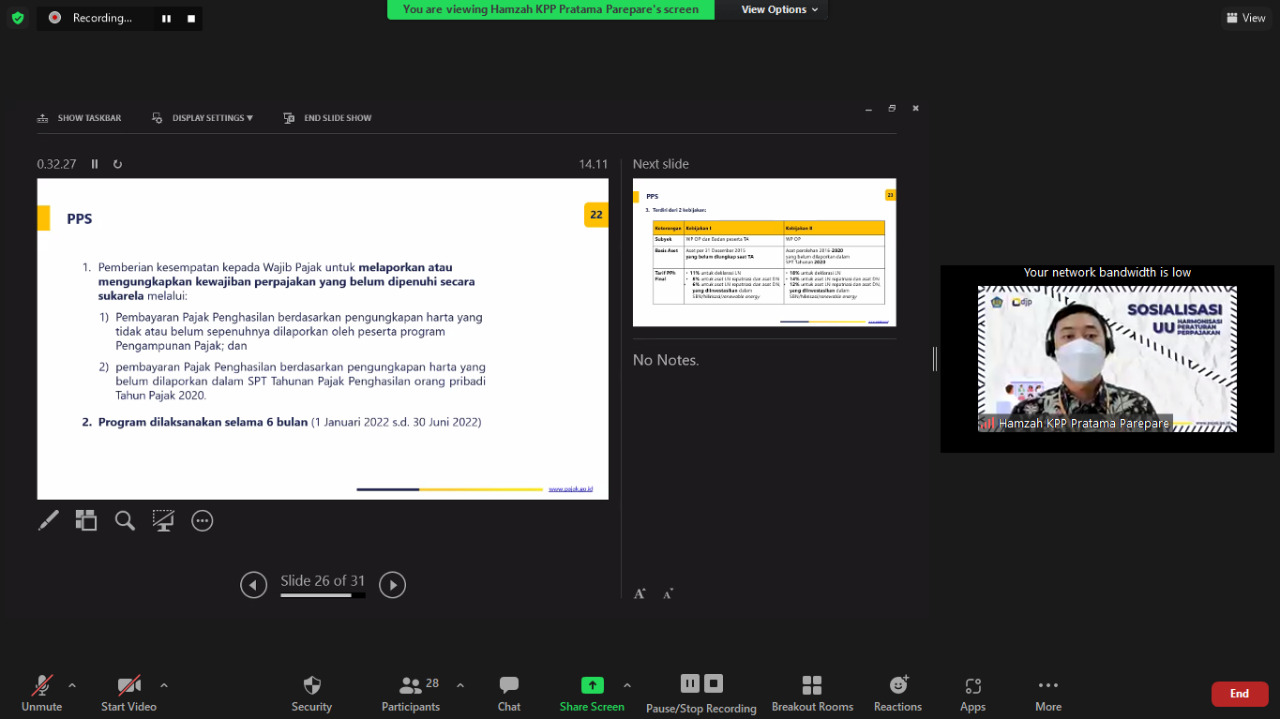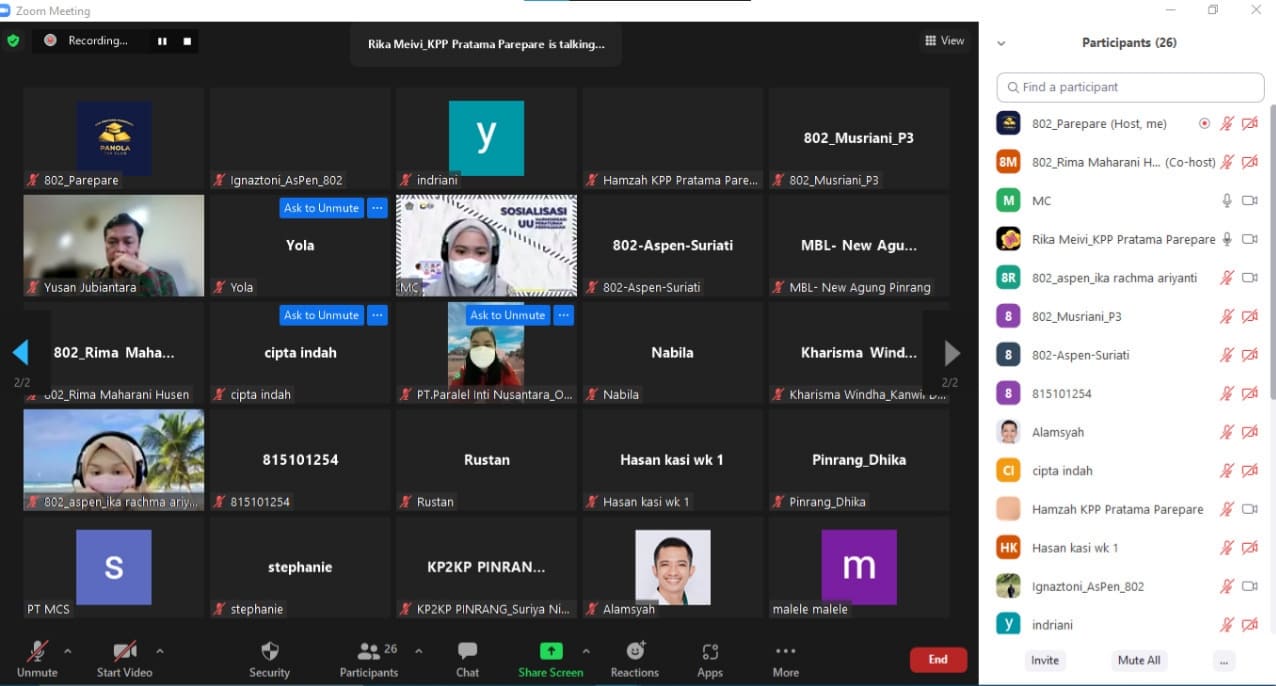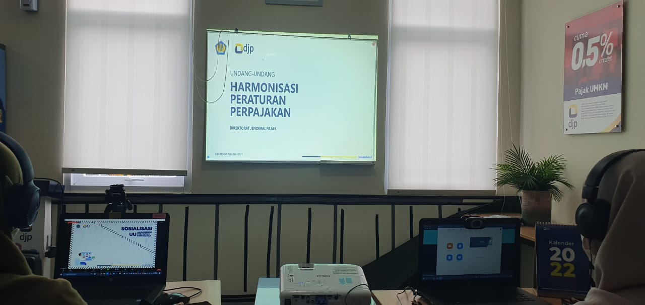 Kantor Pelayanan Pajak (KPP) Pratama Parepare mengadakan kegiatan Sosialisasi Undang-Undang Harmonisasi Peraturan Perpajakan (UU HPP) yang ditujukan kepada wajib pajak strategis secara daring melalui Zoom Meeting (Selasa, 7/12). Tim penyuluh pajak KPP Pratama Parepare memandu langsung jalannya acara di ruang kelas pajak KPP Pratama Parepare, Kota Parepare.
