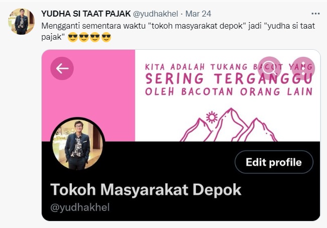 Akun Twitter komedian asal Depok, Yudha Ramadhan atau biasa dikenal dengan Yudha Keling (@yudhakhel), mengganti nama akun Twitter dari Yudha Tokoh Masyarakat Depok menjadi Yudha Si Taat Pajak. Kepala Seksi Pelayanan Kantor Pelayanan Pajak (KPP) Pratama Depok Cimanggis Junus Sulistyawan menyampaikan, "Yudha mengganti profil setelah membayar pajaknya," ujar Junus, Depok (Kamis, 14/4).