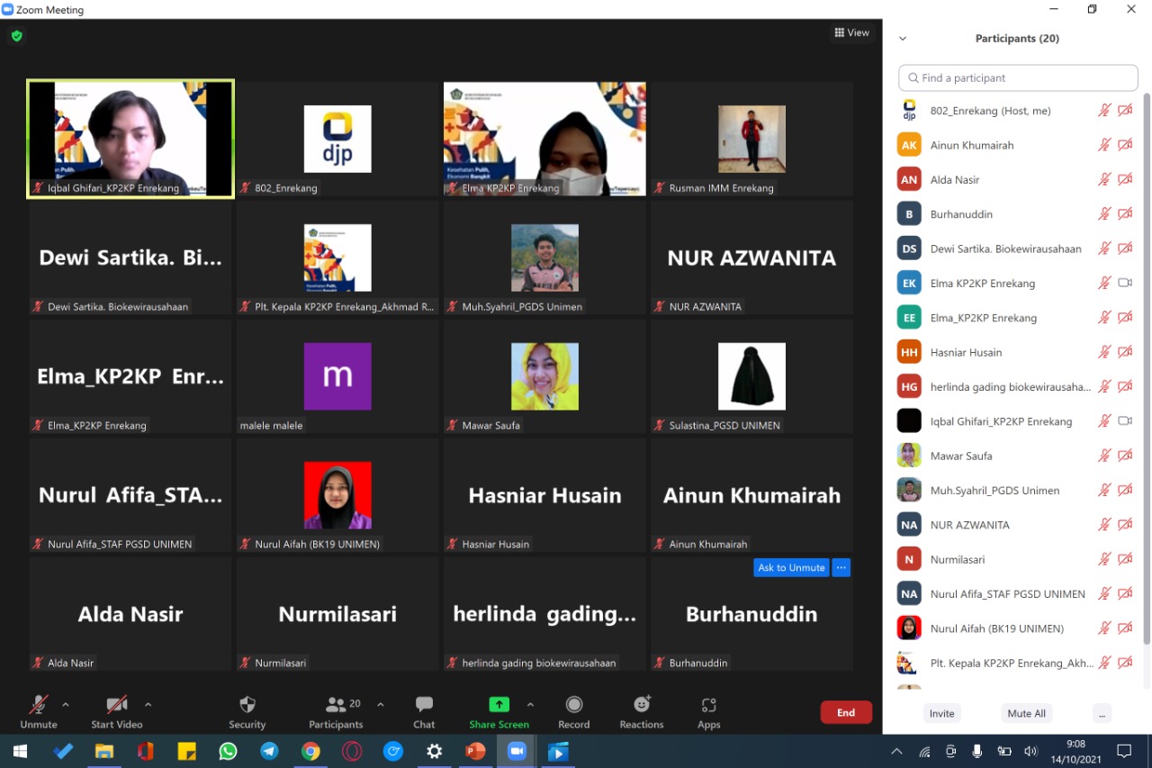 Kantor Pelayanan, Penyuluhan, dan Konsultasi Perpajakan (KP2KP) Enrekang menyelenggarakan kegiatan Tax Goes to Campus (TGTC) dengan melibatkan mahasiswa Universitas Muhammadiyah Enrekang (Unimen) sebagai peserta acara. Panitia acara dari KP2KP Enrekang melangsungkan kegiatan ini secara daring dari ruang kelas pajak KP2KP Enrekang, Kabupaten Enrekang (Kamis, 21/10).
