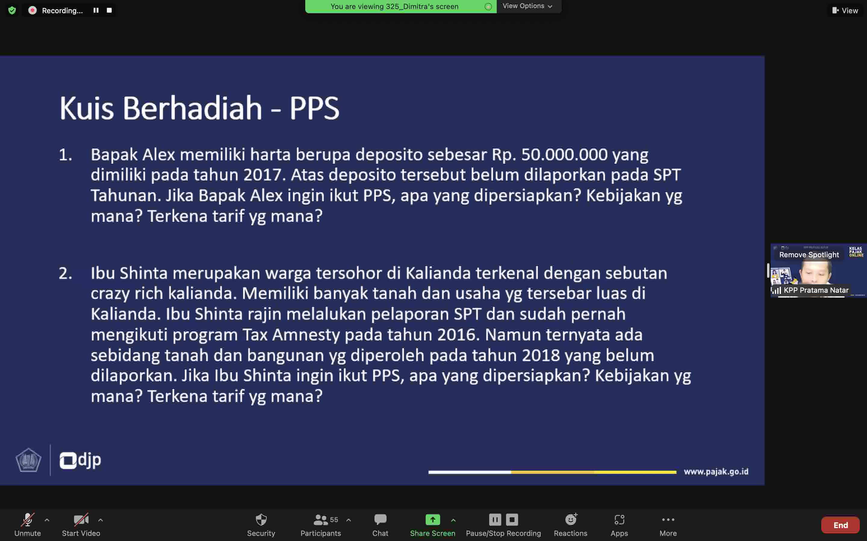 Kantor Pelayanan Penyuluhan dan Konsultasi Perpajakan (KP2KP) Kalianda bekerja sama dengan Kantor Pelayanan Pajak (KPP) Pratama Natar menyelenggarakan kegiatan sosialisasi dan penyuluhan tentang Program Pengungkapan Sukarela (PPS) 2022 dan Kewajiban Perpajakan bagi para Apoteker sebagai pegawai Apotek, Lampung Selatan (Kamis, 14/04). Kegiatan ini diikuti oleh para Apoteker di wilayah Kabupaten Lampung Selatan.