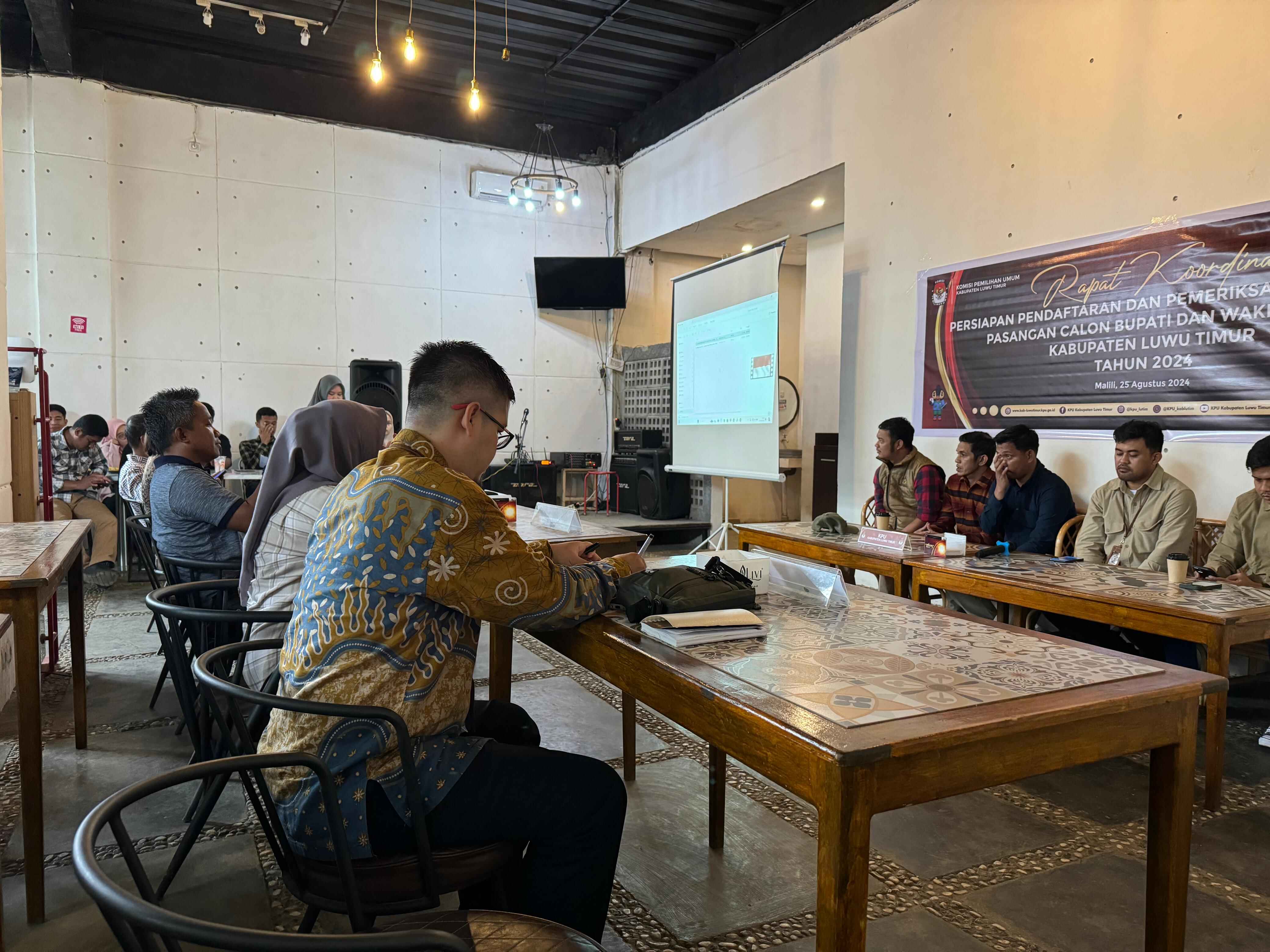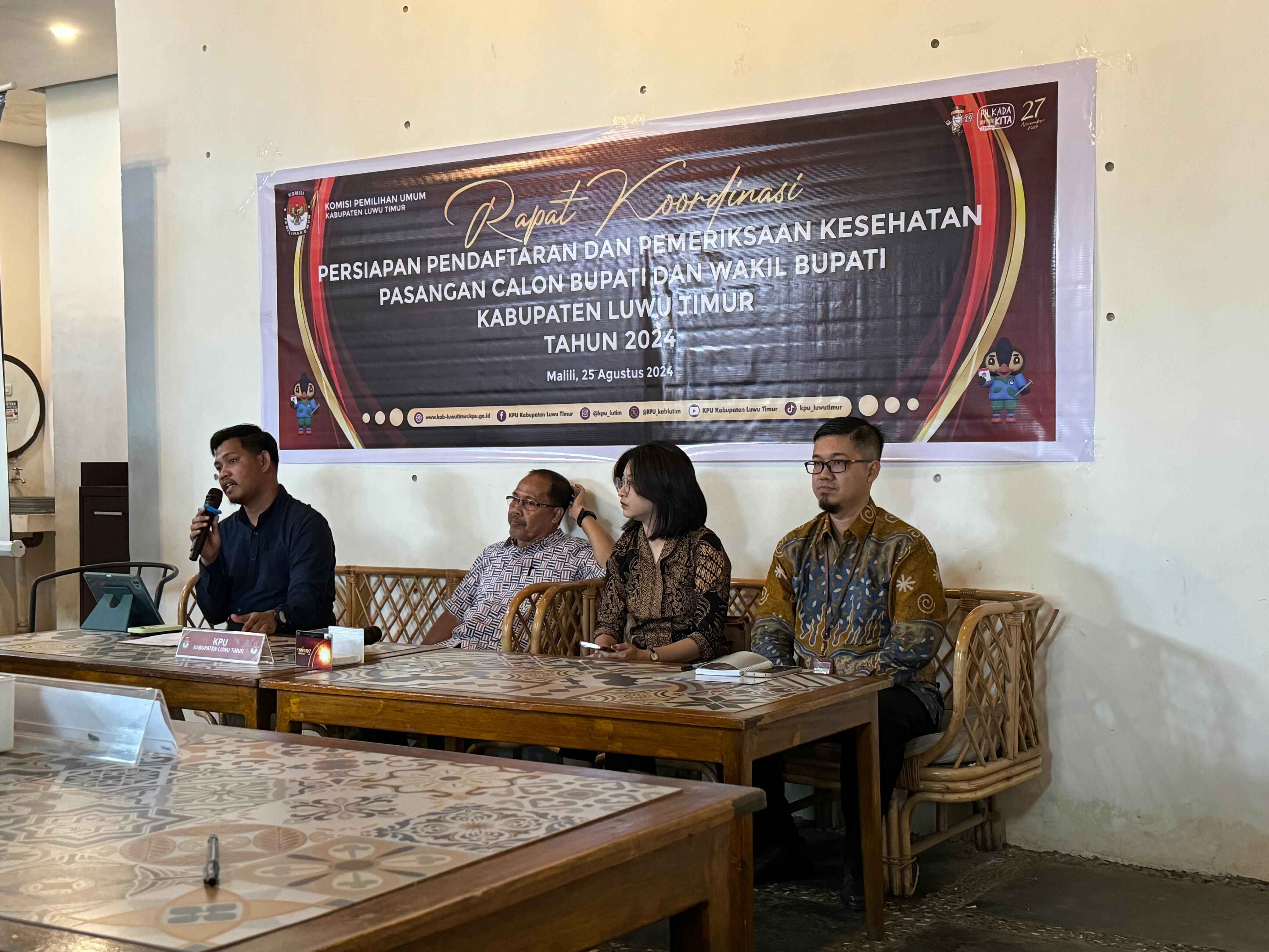 Divisi Teknik Penyelenggaraan KPU Luwu Timur Yusril Hidayat menjelaskan rapat koordinasi ini bertujuan untuk memastikan seluruh persyaratan pencalonan dan kelengkapan dokumen bagi pasangan calon yang sudah dipenuhi. “Rapat ini kami adakan untuk memastikan semua persyaratan pencalonan oleh pasangan calon sudah lengkap dan siap untuk dilakukan pendaftaran pada tanggal 27-29 Agustus mendatang,” ujar Yusril.
