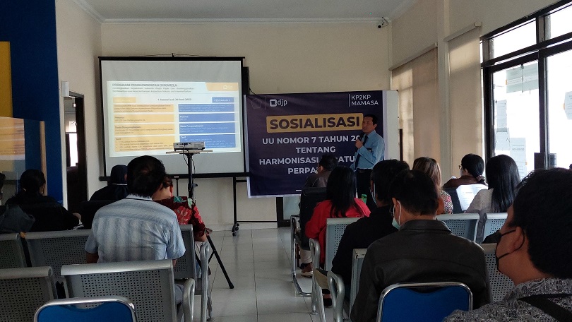 Kantor Pelayanan, Penyuluhan, dan Konsultasi Perpajakan (KP2KP) Mamasa menggelar acara Sosialisasi Undang-Undang Harmonisasi Peraturan Perpajakan (UU HPP) yang ditujukan kepada wajib pajak di Kabupaten Mamasa (Rabu, 8/12). Kegiatan ini dilangsungkan secara tatap muka di ruang aula KP2KP Mamasa, Kabupaten Mamasa.